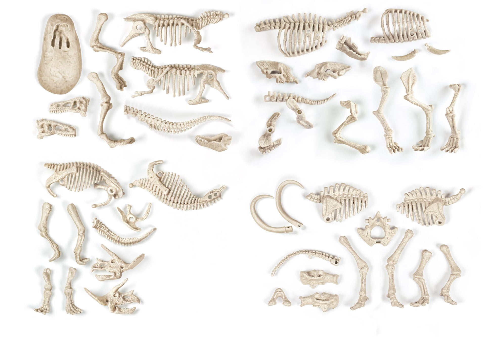 ["Paleontology set for children aged 7 and up: Explore the secrets of the past with this learning set designed for children aged 7 and up, providing a playful and realistic introduction to the fascinating world of paleontology with appropriate tools.","Assembly required: Reconstruct the luminescent skeletons of T-Rex, Triceratops, Mammoth, and Smilodon, a captivating activity that will awe children and stimulate their motor skills while they learn the basics of archaeology.","INCLUDES SHAPE TOOLS - Use the included hammer and chisel to dig into the blocks like a real paleontologist, uncovering hidden fossils in realistic material for a hands-on and immersive learning experience that captures attention.","REALISTIC APPLICATION - Download the free app 'Legendary Creatures' to extend the excavation experience by digitally interacting with the reconstructed creatures using playful special effects.","Realistic digging blocks: Made of gypsum, pumice, and sand, these blocks simulate real archaeological excavations, fostering curiosity, scientific rigor, and hand-eye coordination in children through their discoveries."]