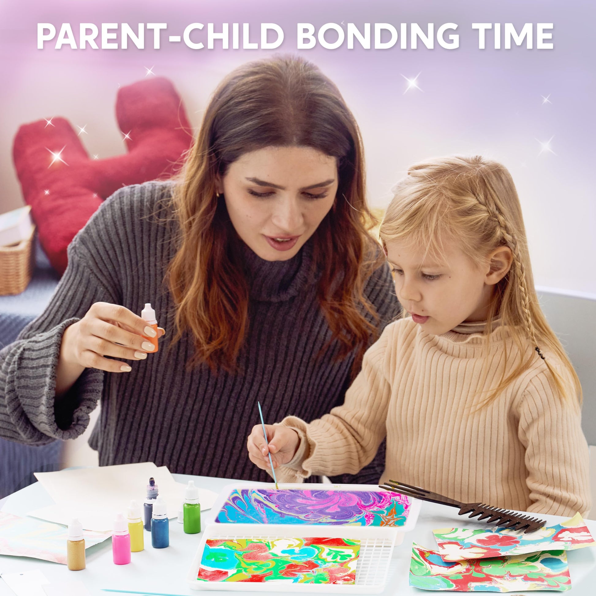 ["ALL-IN-ONE Marbling Paint Craft Set: Everything you need to get started is included in this set, from the design tray with drying rack to 6 vibrant paint colors, 1 gold metallic paint, and a selection of tools including a comb and pens, pipettes and spreaders. Additionally, you will receive 10 art sheets, 3 blank greeting cards, 3 envelopes, and 6 blank bookmarks, offering endless artistic possibilities.","Clean with Drying Rack: Our magic marbling art includes a perfectly sized drying rack that fits the art tray, effectively catches paint drips, and promotes efficient drying of your marbled creations. Enjoy the convenience of hassle-free drying by simply placing your artwork on the rack, keeping your workspace tidy.","Unleash Creativity with a Golden Touch: Stand out with our exclusive gold metallic paint and add a touch of luxury and sophistication to your artwork. Experiment with applying, smearing, and transferring paint to achieve fascinating marble effects. Explore the ancient technique and let your imagination run wild to create fascinating patterns reflecting your unique style.","Safe and Fun Activities for All Ages: Our marbling paint craft set contains safe, non-toxic, and environmentally friendly pigments and Carrageen, making it suitable for children and adults alike. It's a MINT project where you can effortlessly follow instructions, drop color onto the drawing fluid, swirl to create intricate patterns, and transfer them to paper.","Perfect Birthday Gift: Our Water Marbling Paint Craft Set is perfect for various occasions, such as arts and crafts, MINT projects, or DIY activities. It guarantees hours of creative fun and is a thoughtful gift for girls and boys aged 6-12, Easter, Thanksgiving, and Christmas. Let your little ones enjoy crafting their own unique patterns with this perfect children's gift."]