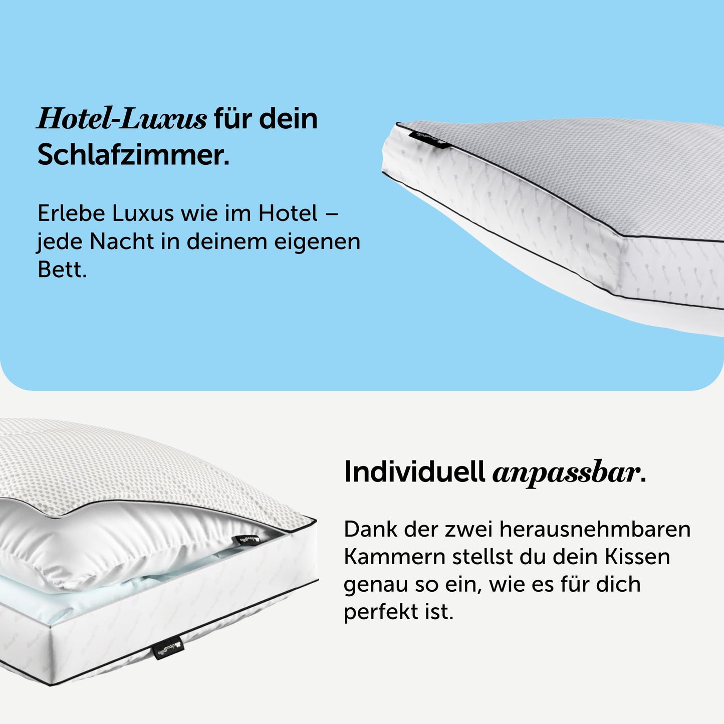 "INDIVIDUALLY ADJUSTABLE HEIGHT AND FIRMNESS - YOUR PILLOW, YOUR COMFORT: Two removable layers allow for easy adjustment for side, back, and stomach sleepers. ERGONOMIC MEMORY FOAM - SUPPORT YOU CAN FEEL: The foam conforms perfectly to head, neck, and spine, promoting healthy alignment and reducing pressure points. HOTEL-SOFT SURFACE FOR HOME - LUXURY EVERY NIGHT: High-quality microfibers provide a silky-soft feel and comfortable support. TEMPERATURE-REGULATING COVER - COMFORTABLE CLIMATE ALL YEAR ROUND: The breathable material adjusts to the ambient temperature - for comfortable sleep in summer and winter. OEKO-TEX CERTIFIED AND SKIN-FRIENDLY - TRUSTWORTHY SAFETY: Free of harmful substances and ideal for sensitive skin. Fits all pillowcases in 16x32 inches."