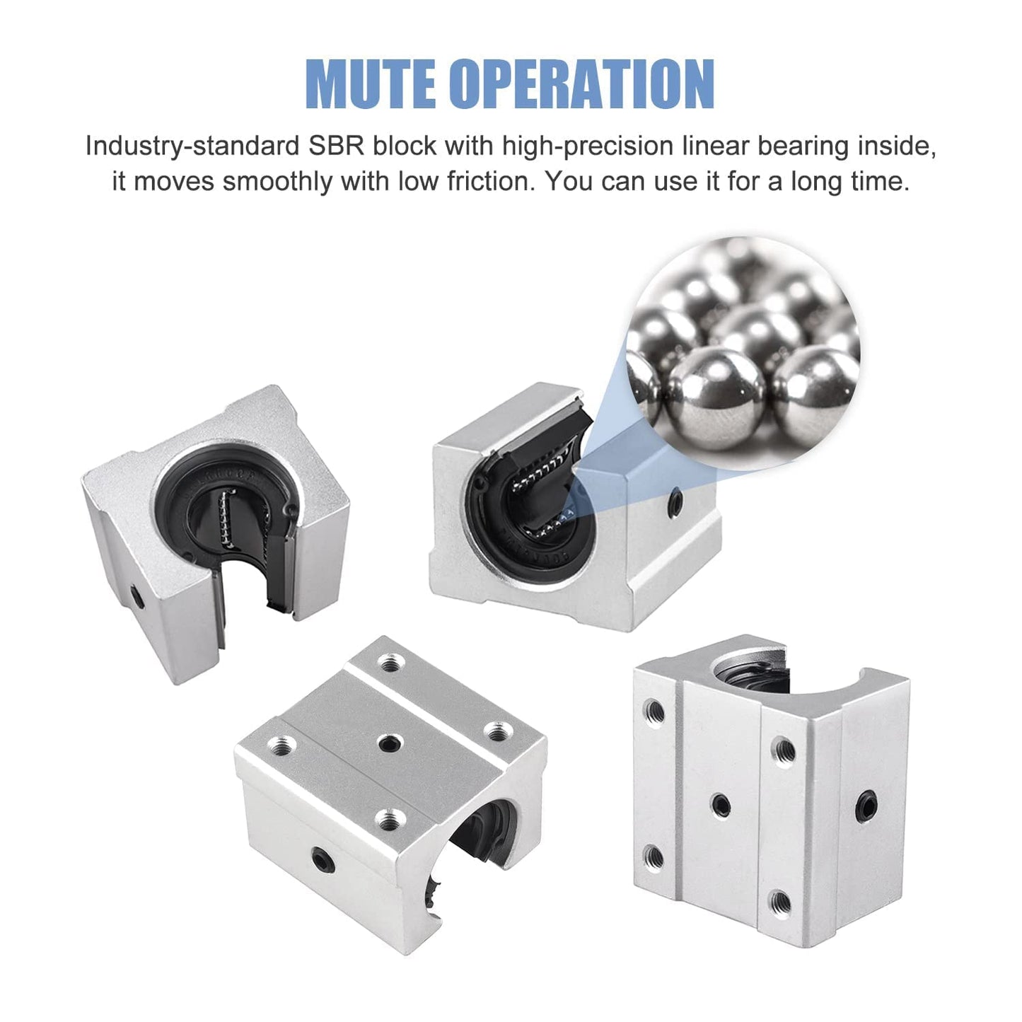 ["This linear rail set includes 2 pieces of 1000mm long rail shafts with 4 pieces of SBR20UU blocks and 4 pieces of 20mm end stops.","The sliding block is used in conjunction with the rail, and the internal linear bearing ensures smooth sliding.","Smooth and beautiful surface, high dimensional accuracy, low friction coefficient, good wear resistance.","No stick-slip effect, less heating, reduced drive power required. High static and dynamic stiffness.","Used with an aluminum end stop ring, it is more flexible and can meet various scenarios and needs."]