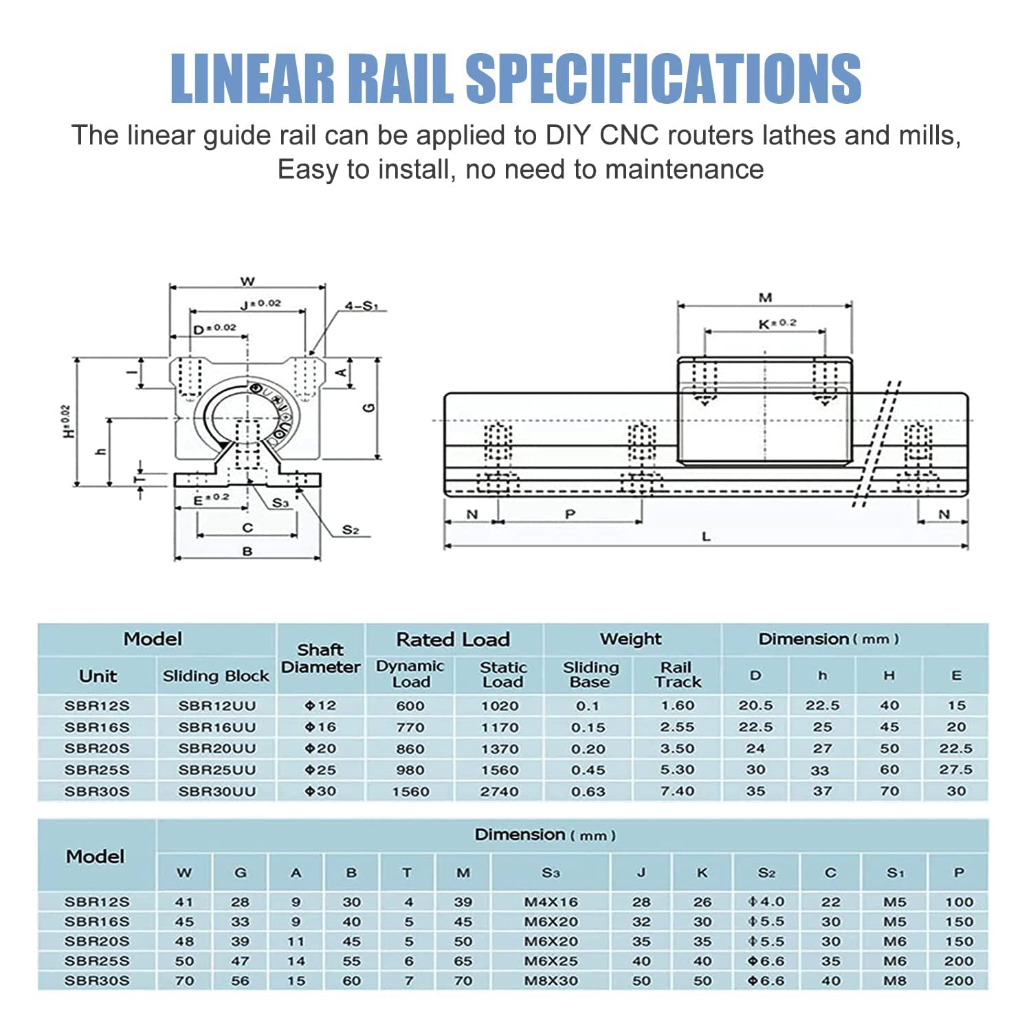 CNCMANS 2 pieces SBR20 1200mm linear guide rail with 4 pieces SBR20UU linear bearings and 4 pieces 20mm stop rings for 3D printers.