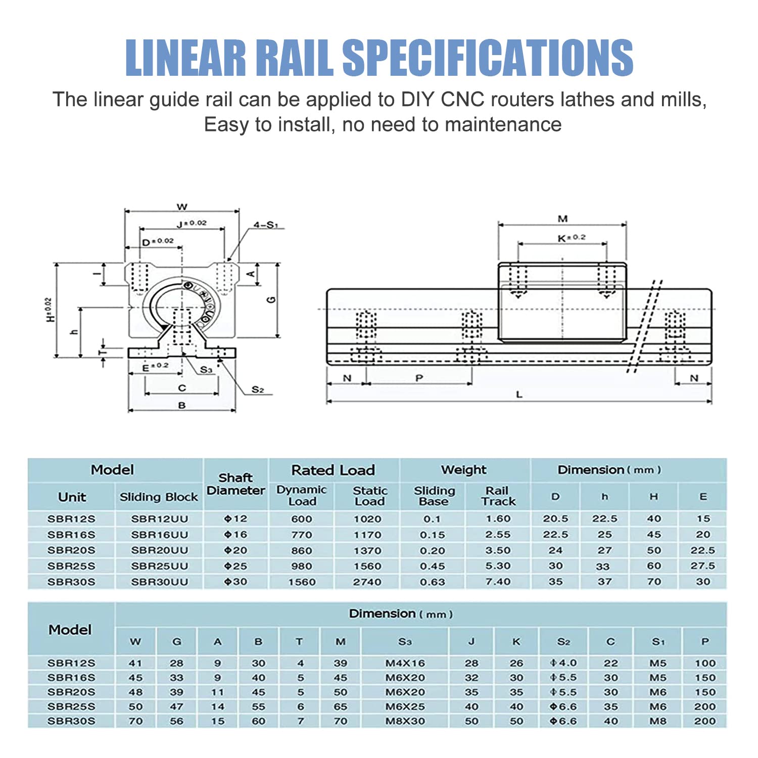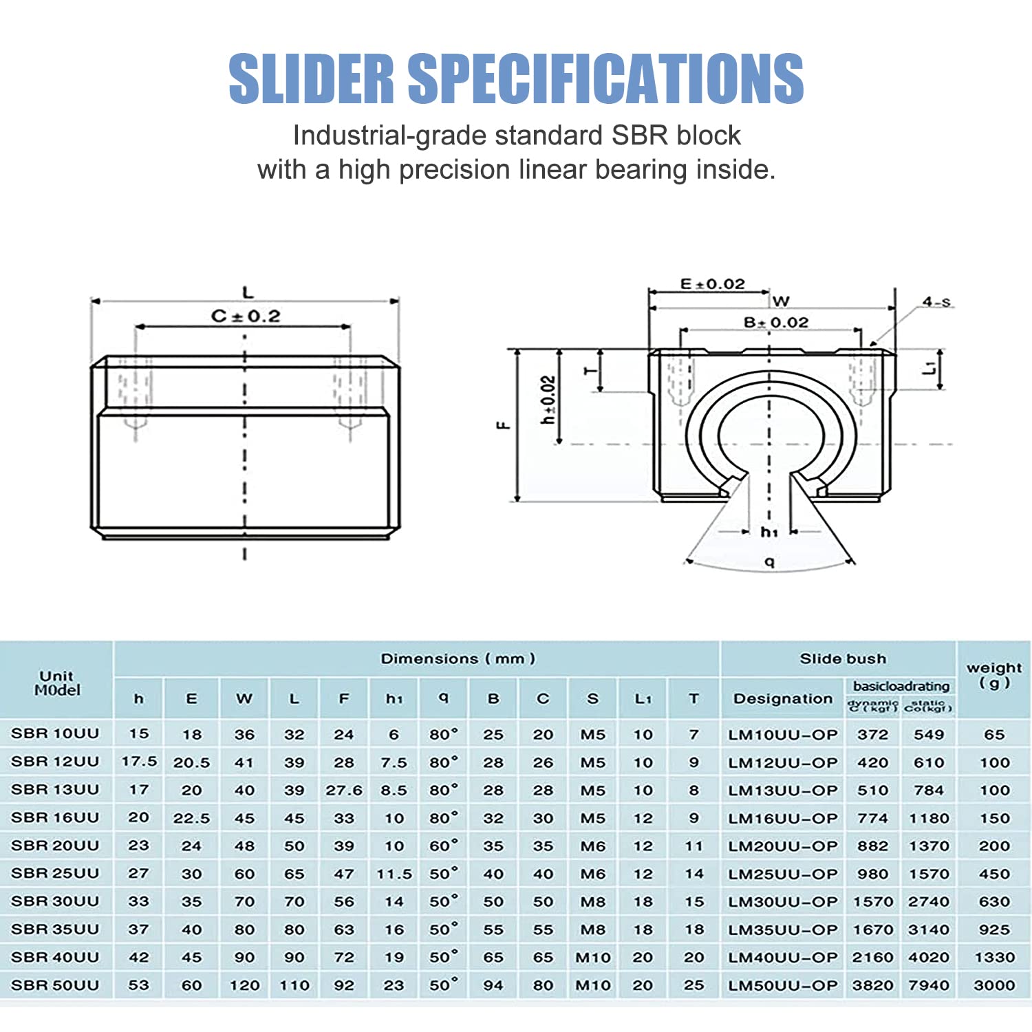 "Standard SBR block in industrial quality with high-precision linear bearing inside, smooth operation. Surface oxidation treatment, beautiful and rust-free. High accuracy and stable performance. Support rails made of aluminum alloy with pre-drilled holes are easy to install and require no maintenance. This product is small and lightweight, suitable for most automatic devices. It will meet your different requirements. No stick-slip effect, less heating, reduced drive power required. Low friction loss, high transmission efficiency."