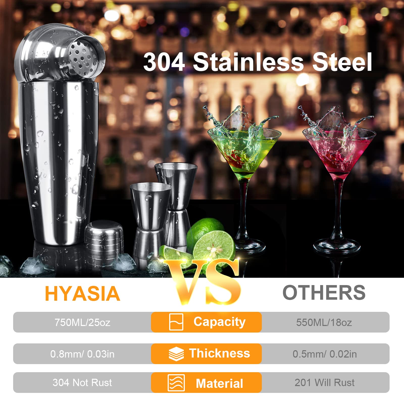 "Premium 304 Stainless Steel Material & Cocktail Recipes: cocktail shaker set is made of Thickened 304 Stainless Steel with strong, Anti-Rust, corrosion resistant and easy to clean. Each cocktail accessory is carefully made. We provide Cocktail Recipe Card to create drinks or cocktails such as: Martini, Vodka, Gin, Wine, Whiskey, Rum, Margarita, Tequila, Liqueur, or you can DIY any other types.",