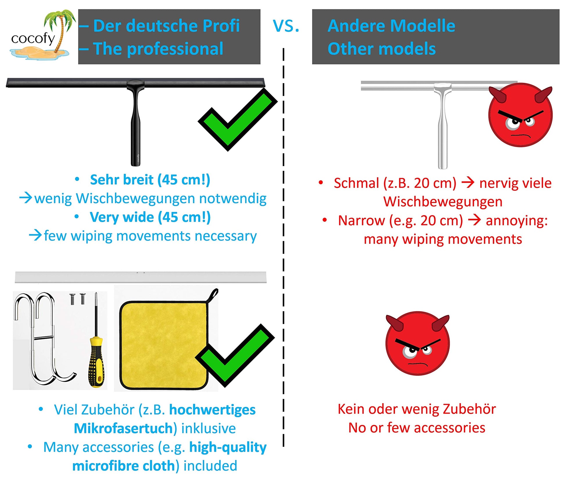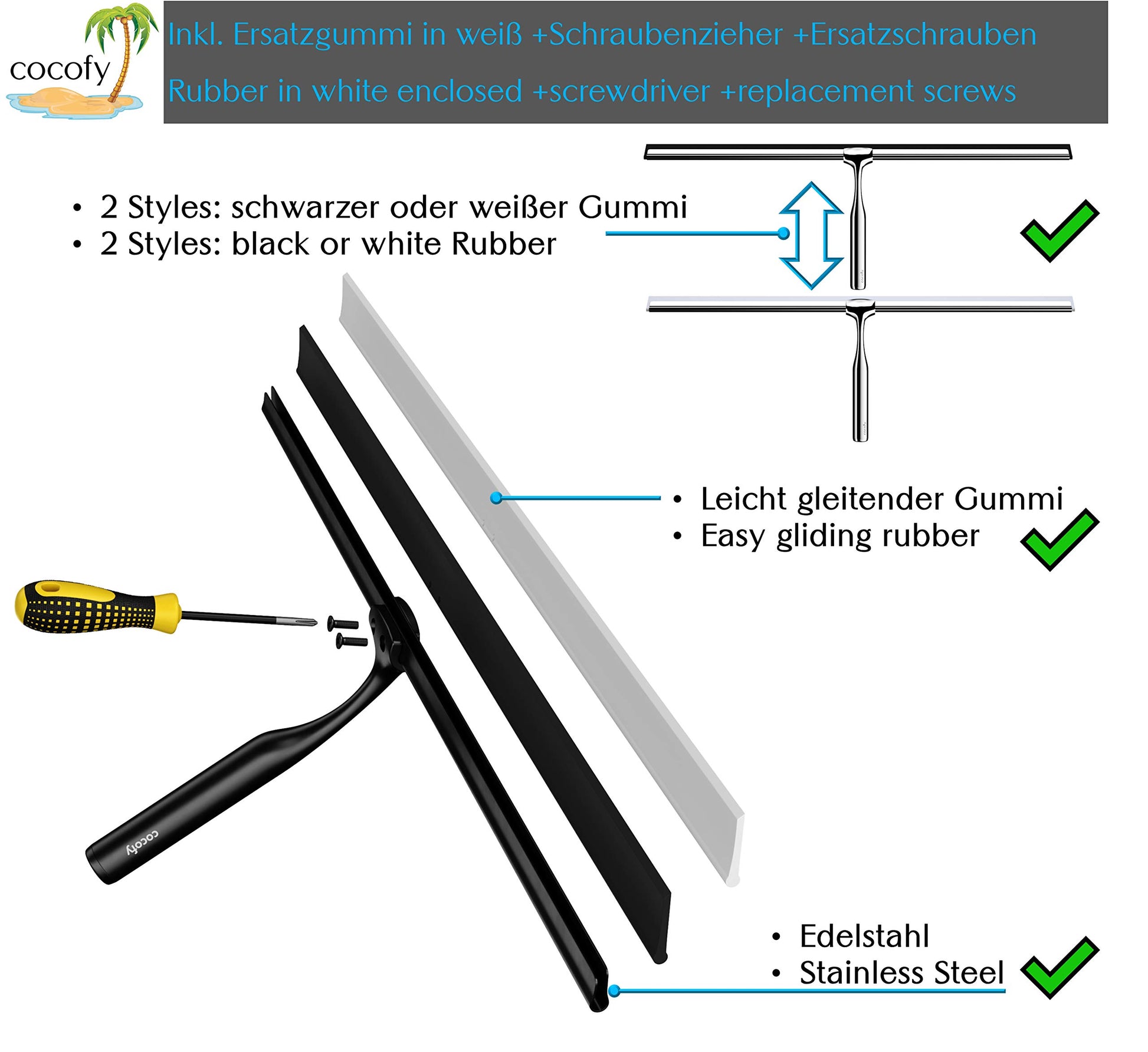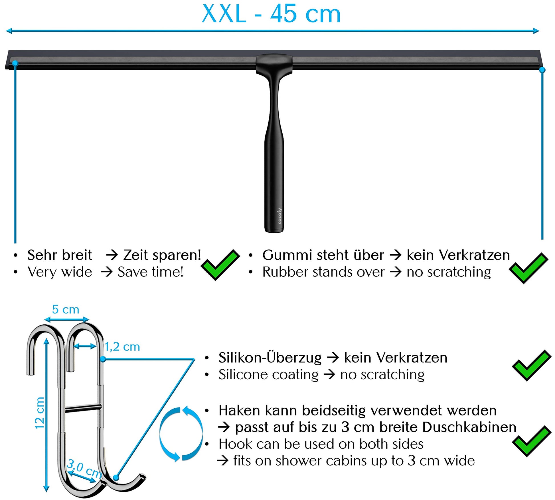 ["✅ ❤️ SAVE TIME - This shower squeegee is 45 cm EXTRA WIDE and wipes a huge area at once, allowing you to finish faster and have more time for the good things in life! ❤️", "✅ 💧🚿 EASY GLIDE - RESIDUE-FREE - Our quality matt black shower squeegee effortlessly removes water with a light gliding motion through the high-quality rubber blade without leaving residue.", "✅ ↔ 2 LOOKS WITH REPLACEMENT RUBBER BLADE - The unique shower squeegee or window squeegee comes pre-assembled with a black rubber blade. The included replacement blade is white, allowing you to create a second look in no time.", "✅ ➕ HOOK & MICROFIBER CLOTH - Exclusive with our shower door squeegee or window squeegee is a stainless steel hook for storage and a microfiber cloth.", "✅ ❌ NO SCRATCHES - The high-quality rubber extends on both sides of the wide shower squeegee or bathroom wiper to prevent scratching. ❌"]