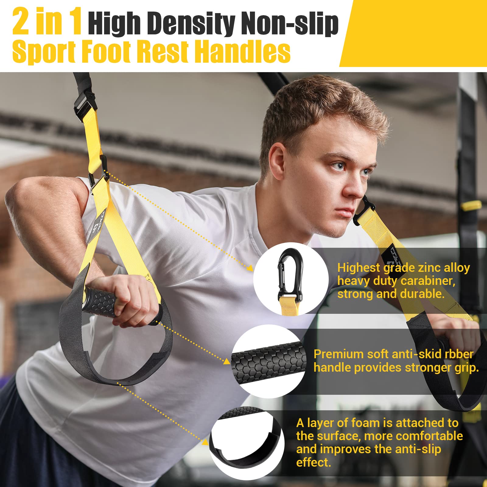 "【High-Quality Suspension Trainer】Suspension Trainer Kit includes 1 safety locking ring, 2 adjustable resistance bands, 2 training straps with handles and soft anchors, 1 door anchor, 1 extension strap, 1 workout manual, a carrying bag. These training straps are designed for durability and feature a comfortable, grip-resistant TPR handle that can withstand weights of up to 500 pounds body weight and over 1,000 pounds of resistance.",