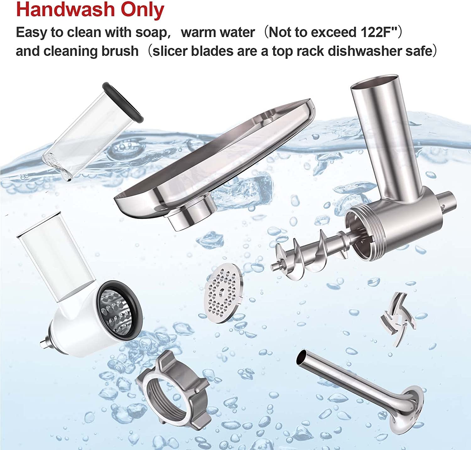 ["【Upgrade Design】 COFUN meat grinder attachment for kitchenaid designed and has more than ten years of experience in accessory manufacturing. This upgraded version adds a large sausage stuffer that can accelerate the grinding speed and increase the efficiency of sausage filling. (NOTE: 1. This accessory is not made by KitchenAid. 2. This product contains accessories only, no kitchen machine).","【Full Metal Design】 High-quality food grinder body made of aluminum alloy and larger tray made of stainless steel. With the meat grinder attachment for KitchenAid, high-quality minced meat can be produced. Excellent performance in terms of speed, cleanliness, and durability.","【Multifunctional Attachment】 3 sizes of sausage stuffing horns, 2 grinding blades, and 4 different sizes of grinding plates can meet all your KitchenAid attachments needs. Easily grind meat, fruits, vegetables, hard cheese, make breadcrumbs, etc., to prepare delicious foods such as burgers, hearty pizzas, sausages, etc. in a healthier way at home or at parties. Please choose meat without tendons, bones, and fat, and cut it into strips of about 2cm x 2cm x 6cm size for best results!","【Special Sausage Stuffer for KitchenAid】 The unique design of the sausage stuffing tube significantly improves filling efficiency. 3 sizes (0.45 inches, 0.73 inches, 1 inch) can make different sizes of sausages, pudding sausages, and Italian sausages that you like to make.","【Easy to Clean and Store】 This KitchenAid accessory is not dishwasher safe, but all parts are metallic, removable, and easy to clean manually. It is recommended to use warm soapy water (below 122°F) for cleaning. Insert the meat before starting the meat grinder, do not run it empty. Turn the locking ring until it clicks into place, but do not tighten it too much, overtightening can damage the blades and the meat grinder."]
