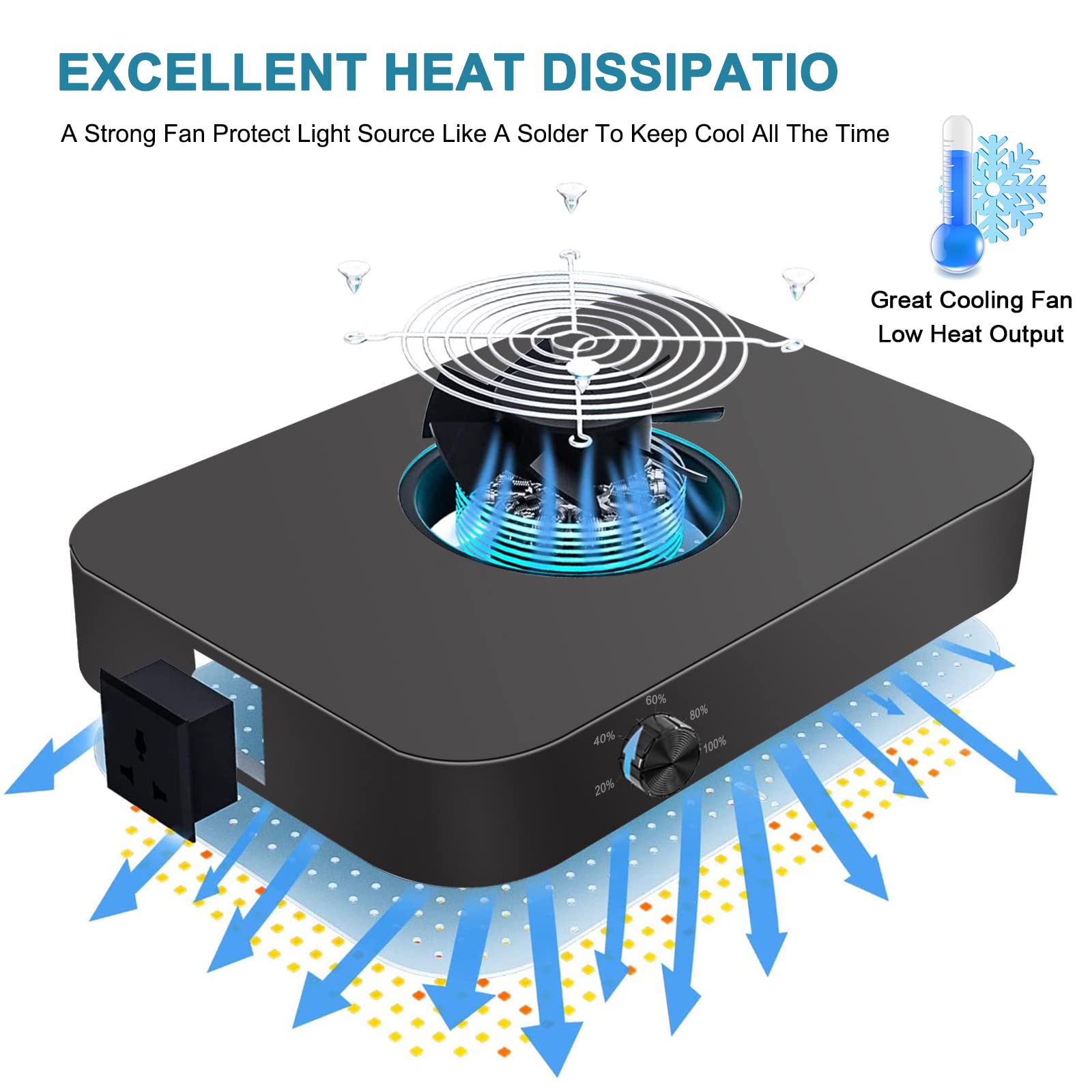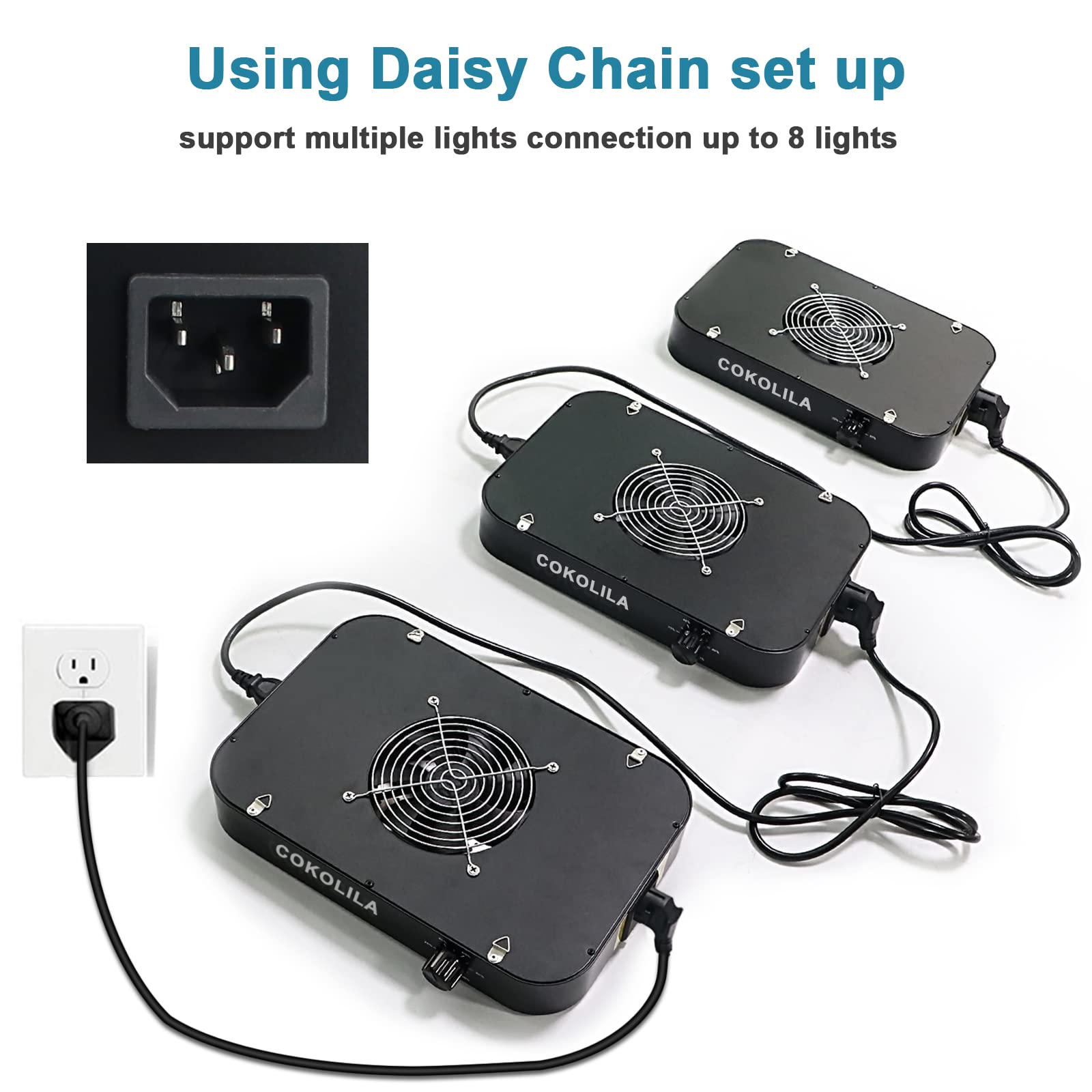 ["Lower costs and higher yields: In our plant light, 584 of the latest SMD LEDs are installed, resulting in high energy efficiency with 2.7 umol/J. Power consumption is 130 W, Max 2.0g/W. Perfect for an area of 4 x 4 ft in the growth phase and 3 x 3 ft in the flowering phase", "Full spectrum LED grow light: Our plant light grows with full spectrum white, blue, red, UV, and IR (3000 K, 5000 K, 660 nm, UV 395 nm, and IR 760 nm). 3000K diodes provide more reddish light and the 5000K diodes provide more bluish light. 660 nm red and IR light is especially useful during flowering, where it accelerates flowering time and increases yields. Perfect for germination, growth, flowering, and harvesting", "Dimmable and stronger cooling system: An additional dimmer knob controls the brightness of the entire LED grow light and allows for flexibility to achieve perfect growth performance for each growth phase. You can also dim each light independently. The extra-large fan keeps the diodes cool. With 1 built-in bass high-speed fan and multiple ventilation slots that quickly dissipate heat and prevent the led grow light bulb from overheating and getting damaged", "Daisy Chain design and widespread use: This grow light is a double outlet. You can connect multiple lights together via the Daisy Chain function, but only need one outlet. You can use this grow light in the living room, greenhouse, tent, and hydroponic room. It is very ideal for indoor plant growers, as it is like sunlight, so you won't confuse your neighbors", "Certification and package contents: 2-year protection plan. Safe for indoor use. Product quality and friendly customer service have always been our top priority. If you have any questions, please chat with us via Amazon. Our competent team is available to answer any questions"]