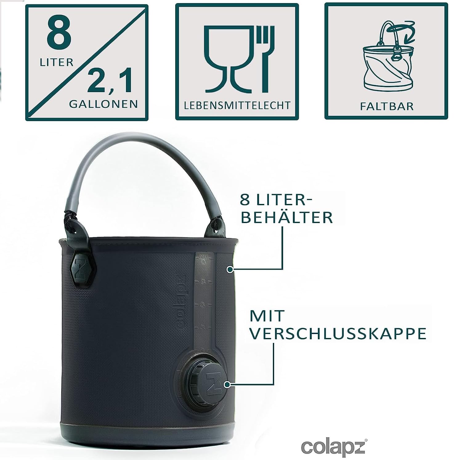 ["2-in-1 Design - An innovative water container that includes both a tap water dispenser and a collapsible bucket. An essential accessory for camping, festivals, caravanning, as well as for general household or garden use. Perfect for the next van trip or traveling in a motorhome.", "Space-saving - Our convenient, space-saving fold design has a removable lid for storing accessories. The multifunctional Colapz 2-in-1 water container can easily be transformed to meet your needs. Space-saving equipment and clever solution.", "Ideal for camping & festivals - With a large capacity of 8 liters, the Colapz 2-in-1 is the perfect water canister. You can use it as a drinking water dispenser or for fresh water for showering or washing, e.g. when camping. Thanks to the water level indicator, you will never be left high and dry.", "Perfect for the motorhome - If you need to keep your motorhome, caravan, or van clean while traveling, simply remove the lid from the Colapz canister and it instantly transforms into a versatile eight-liter bucket. Perfect for cooking, cleaning, showering, or drinking.", "Durable & Sustainable - The lightweight fold design does not compromise the Colapz 2-in-1's durability. The Colapz 2-in-1 is designed to last a lifetime. The water is protected from UV rays and dirt. The container is made from food-safe material and the seams are machine-welded. For optimal stability."]