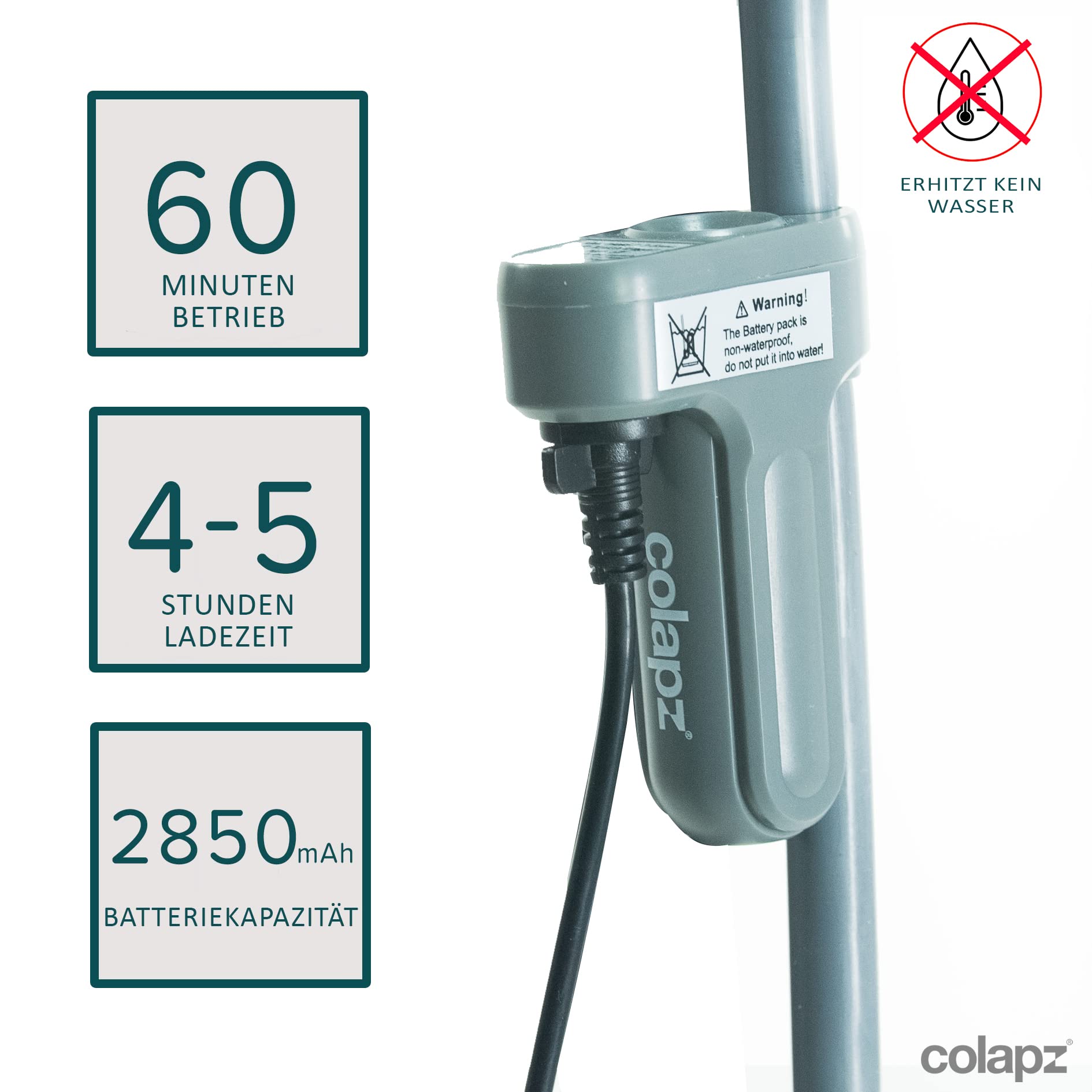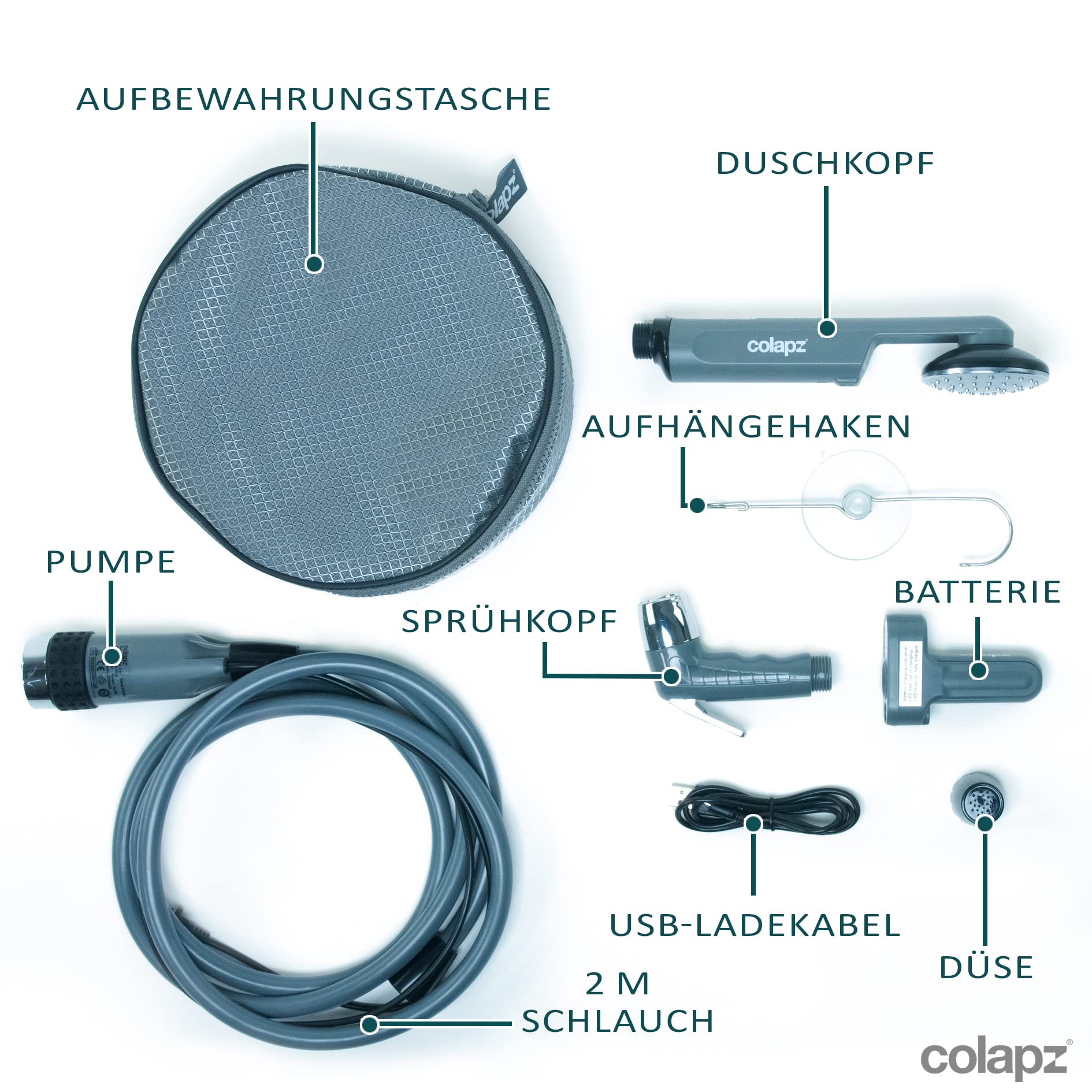 ["Rechargeable Battery Camping Shower with Pump - Our portable USB shower with pump has a battery and is rechargeable at any time. This innovative camping shower is especially practical for camping, traveling, or in the garden. You can use the portable shower with any standing water source as it operates with a pump. This is very convenient when traveling or not near a power source.","Perfect USB Camping Shower - Perfect shower for camping with a tent, van, caravan, or motorhome. You can easily shower yourself or your pet after a day at the beach or a hike. With this innovative, compact design, you can stay fresh even at a festival without having to wait in long shower lines. This is the ultimate camping accessory!","Perfect for Pets - Wash your dog off before jumping back into the car or house after a dirty, muddy walk. You can also use our mobile shower for horses to clean the horse after a ride. Spray off your hiking boots as well to keep everything clean and fresh.","Perfect for Car Wash - Use the included spray nozzle head for your mountain bike, van, caravan, motorhome, car, or motorcycle. For all vehicles that need a thorough cleaning. Easy application without using a heavy garden hose.","Colapz - Colapz is a British brand that develops high-quality and innovative equipment for camping, caravan or motorhome. Browse through our entire range of sustainable products, such as collapsible buckets, camping showers, water containers, watering cans, water or disposal systems."]