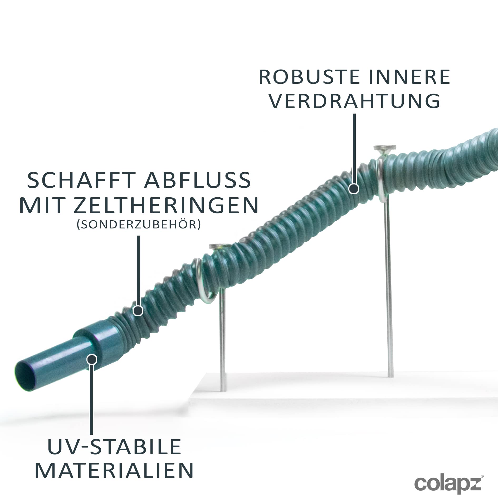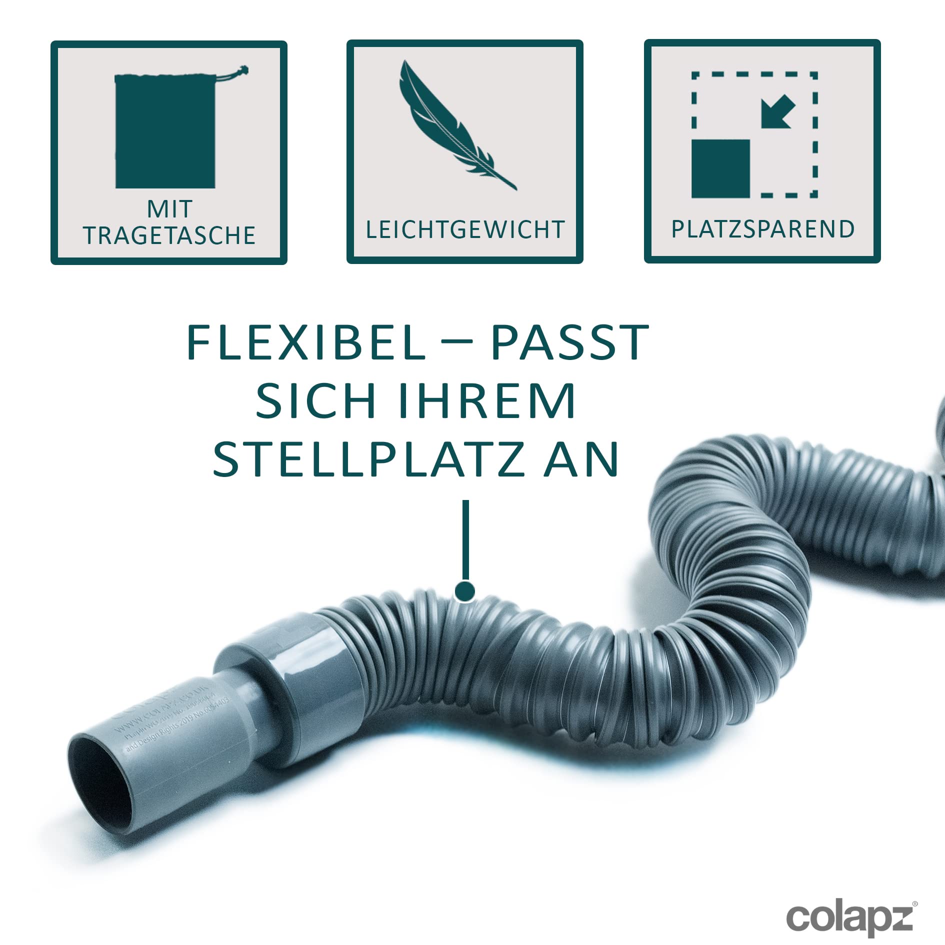 ["Collapsible Design - This product is perfect for all wastewater tank stations on campgrounds. Each of the four flexible 20-inch long segments can be extended to one meter and connected to the other segments, creating a total length of 13 feet. Additional pipes can be added to further extend the system.","Easy Assembly - The segments of this hose connector system easily connect to a standard 1.16-inch wastewater connection for caravans. An adapter is also available for wastewater pipes with a diameter of 0.75 to 2 inches (This accessory must be purchased separately).","Package Includes - Each 'Flexi Waste Pipe' set includes four pipes, a cleaning brush with a one-meter long pull-through chain, and a convenient carrying bag. This allows you to easily clean and store your wastewater hose set, keeping everything organized. The 'Flexi Waste Pipe' system from Colapz is easy to clean and transport.","Accessories - Expand your set with additional meters of pipes and our practical metal support hooks for the right position and optimal drainage. Additionally, there is an adjustable adapter that can be fitted to wastewater pipes with a diameter of 0.75-2 inches, an extra cleaning brush, and an additional carrying bag.","Colapz - Colapz is a British brand that develops high-quality and innovative equipment for camping, caravanning, or motorhomes. Browse through our entire range of sustainable products, such as collapsible buckets, water containers, or watering cans."]