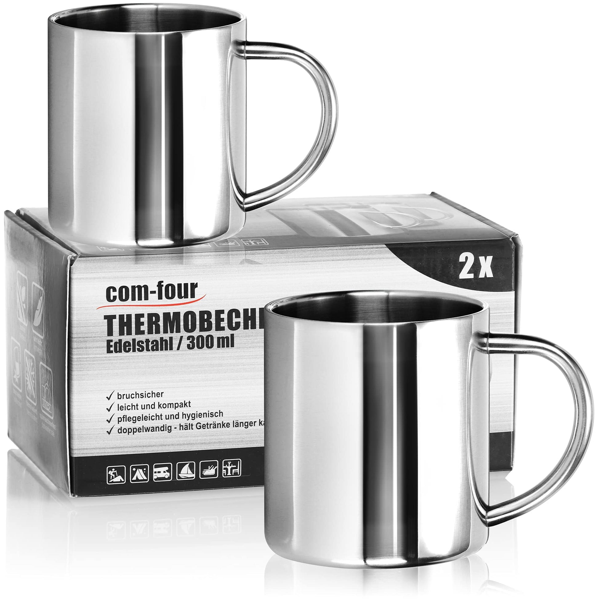 com-four® 2x Stainless Steel Thermal Mug - 300 ml per mug - Double-walled insulated cup - Breakproof coffee cup - Thermal drinking cup - Camping mug - Cup - BPA-free (300ml)