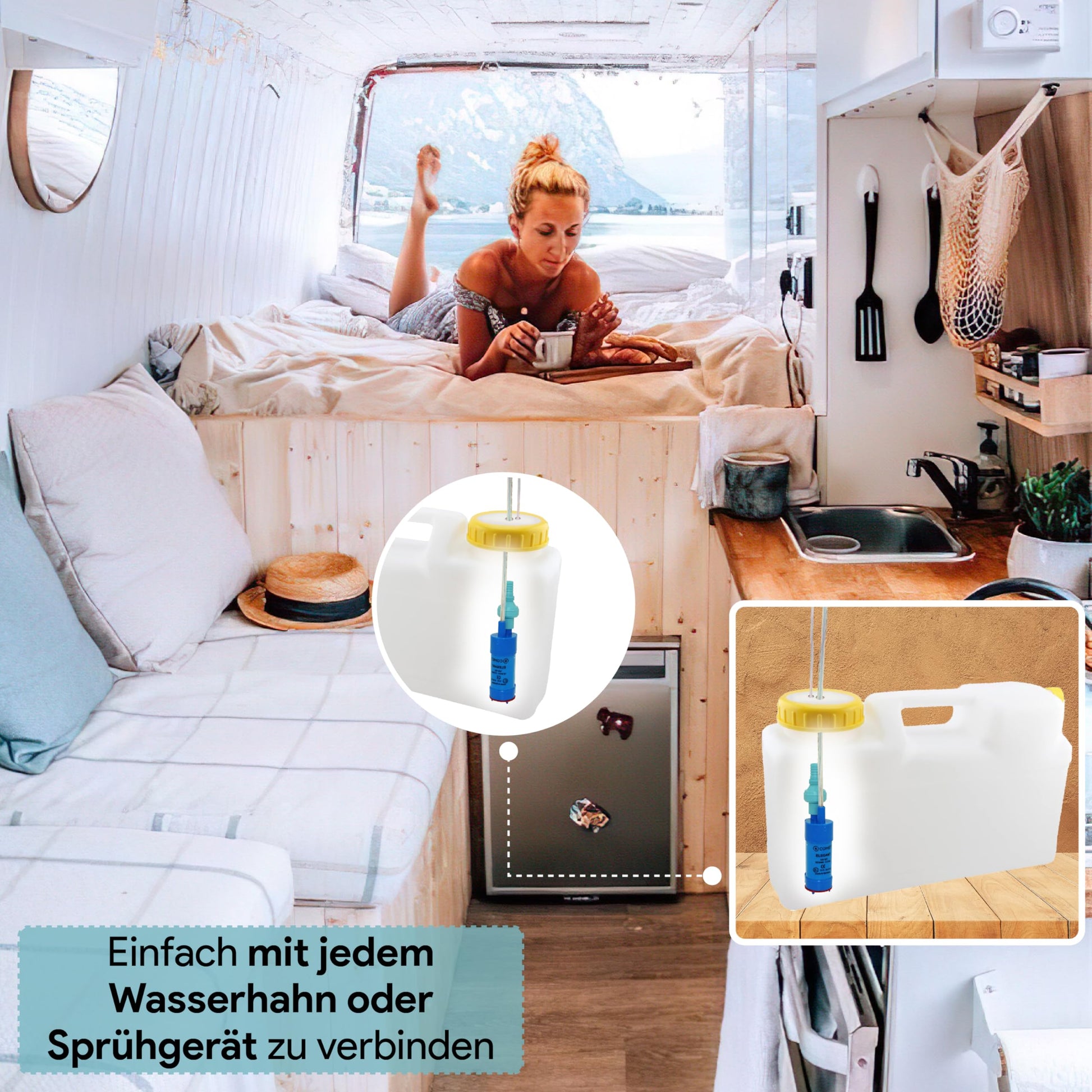 ["Facilitate your camping experience with an efficient water pump. Additionally, you will receive the E-Book On the Road by Stefan Rademacher. Explore together the 20 best campsites in Europe.",