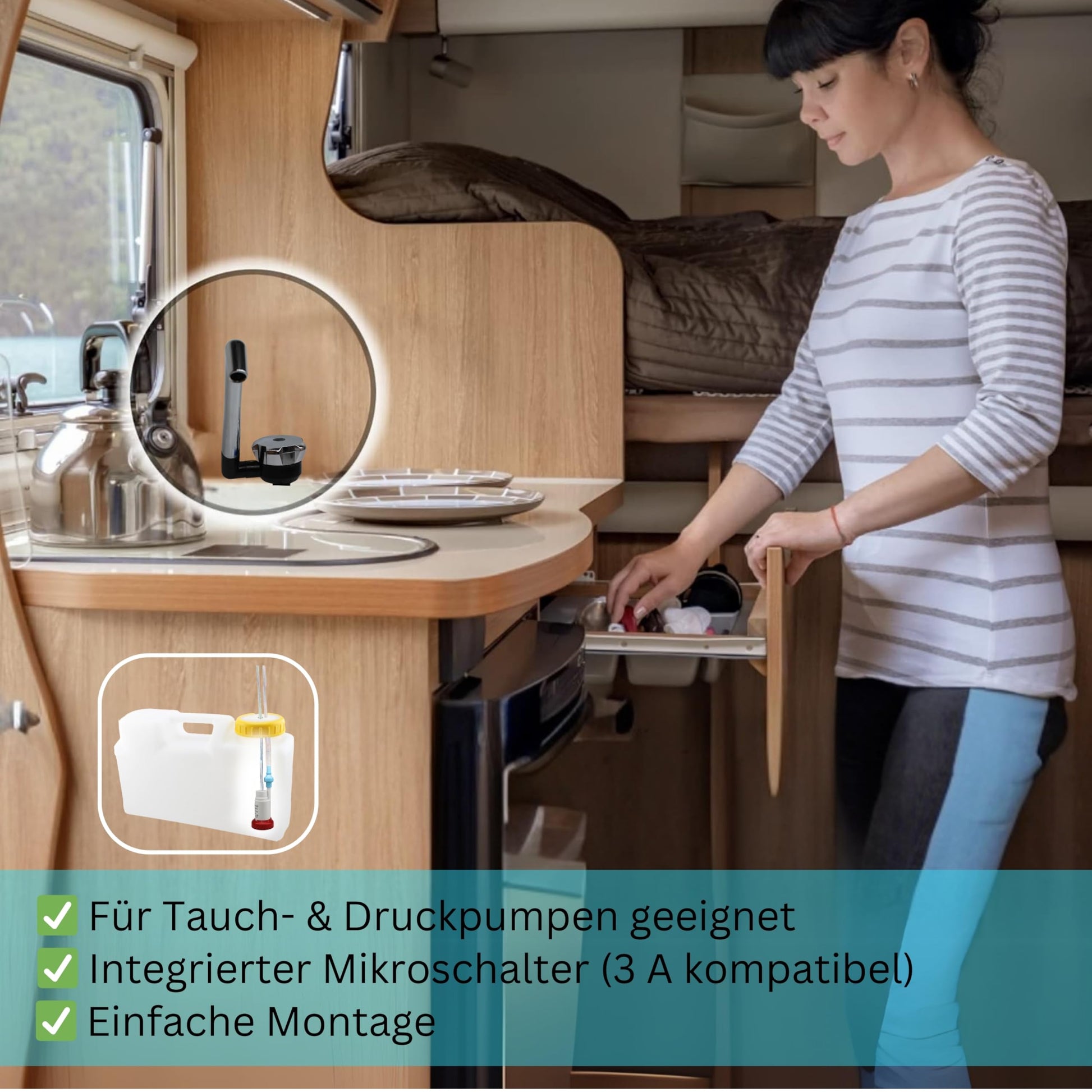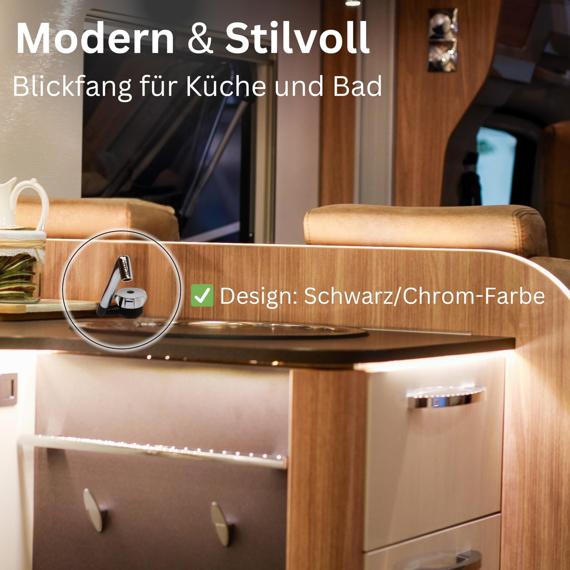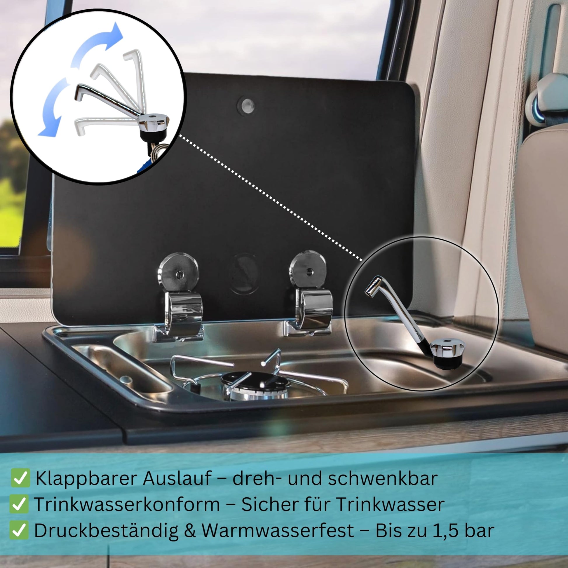 ["Compact Camping Faucet This stylish 12V faucet is ideal for caravan sinks, providing connections for hot and cold water. Perfect for camping enthusiasts and space-saving for mobile kitchens and washrooms.","Flexible 12V Faucet The caravan faucet is compatible with 12V systems and easy to install, making it ideal for camping sinks with a pump. Durable materials ensure a long lifespan outdoors.","Rich design of the single-lever mixer - Our camping faucet combines functionality and style. The Comet 12V faucet allows for easy handling and is perfect for 12V camping faucets in motorhomes and caravans.","Easy installation The faucet is specially designed for camping trailers. With a 12V camping water pump and easy handling, this 12V camping faucet is the ideal solution for mobile washing and washing areas.","MADE IN GERMANY - Robust construction - Our 12V camping pump is perfectly suitable for outdoor use in conjunction with this caravan faucet. Made of durable materials, it offers a reliable solution for all camping enthusiasts."]