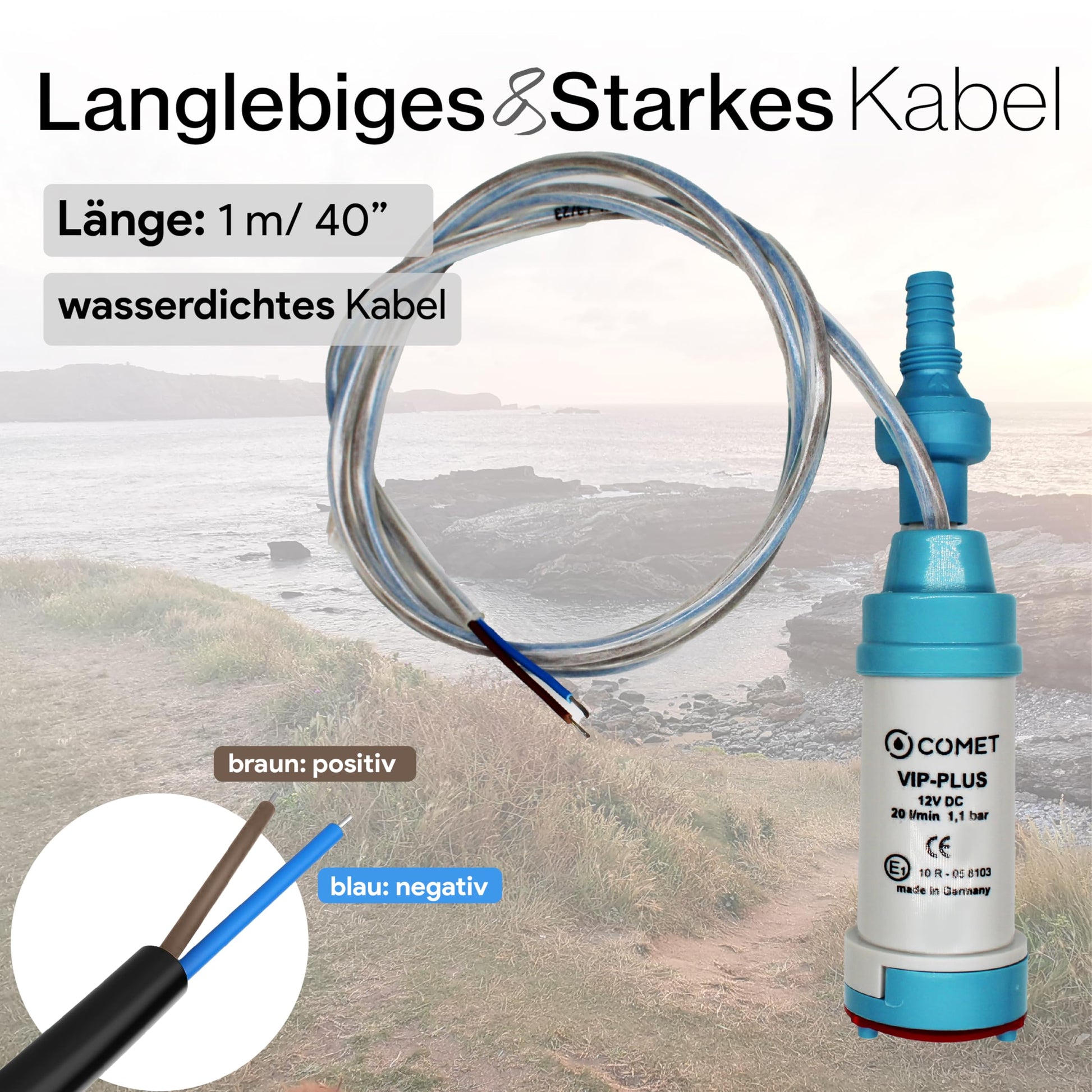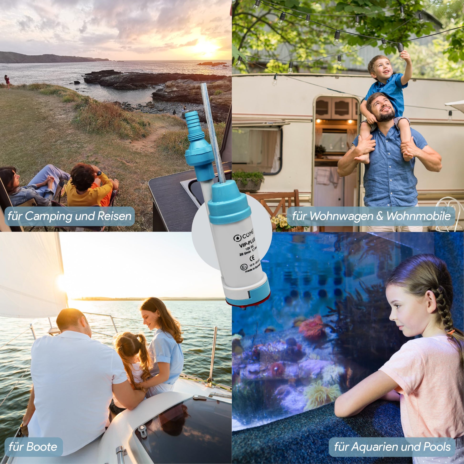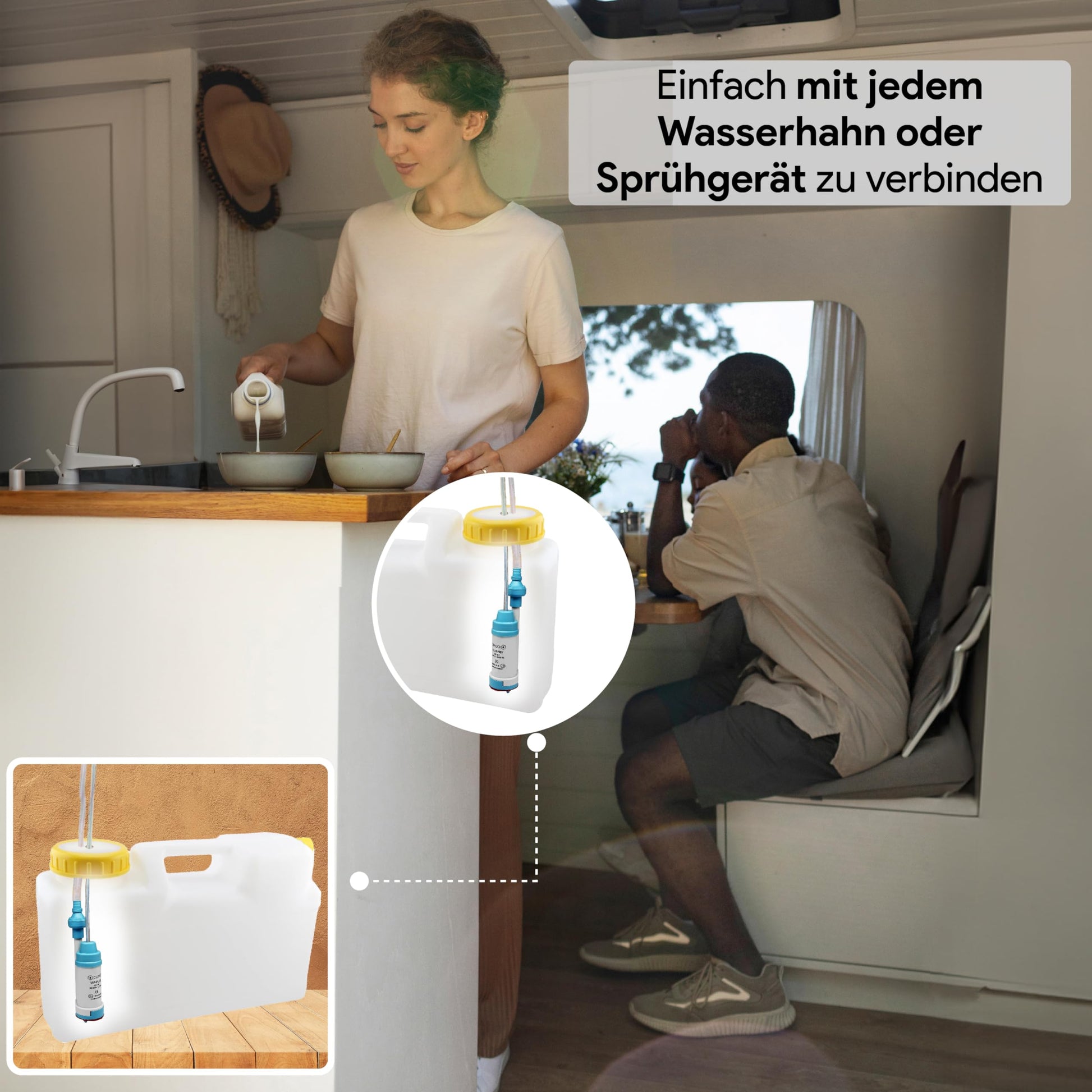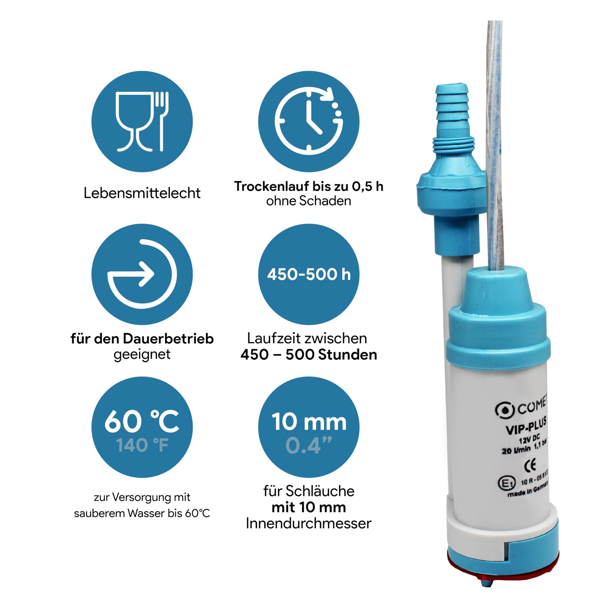 ["Facilitate your camping experience with an efficient water pump. In addition, you will receive the E-Book \"On the Road at Home\" by Stefan Rademacher. Discover the top 20 campsites in Europe.","Powerful & reliable seal - suitable for continuous operation with an impressive runtime of 450-500 hours. Dry run safe for up to 0.5 hours. High-quality mechanical seal ensures a reliable seal. Capacity 20 l/m - 1.1 bar","Robust design. Non-return valve and vent connection: Increases engine lifespan. Prevents water from flowing in reverse. Ensures continuous pumping without air. Filter: Protects your engine from damage. Increases engine lifespan. Guards against small stones and particles.","Perfect size: The pump is equipped with a mini transfer pump design, which is compact and quiet. Perfect for use in water containers with narrow openings. The light weight of 200 g and 12V power make it especially convenient.","Made in Germany All electric cables, motors, and plastic parts are manufactured in Germany, where highest product quality is a priority. Convenient hose connection for added user-friendliness."]