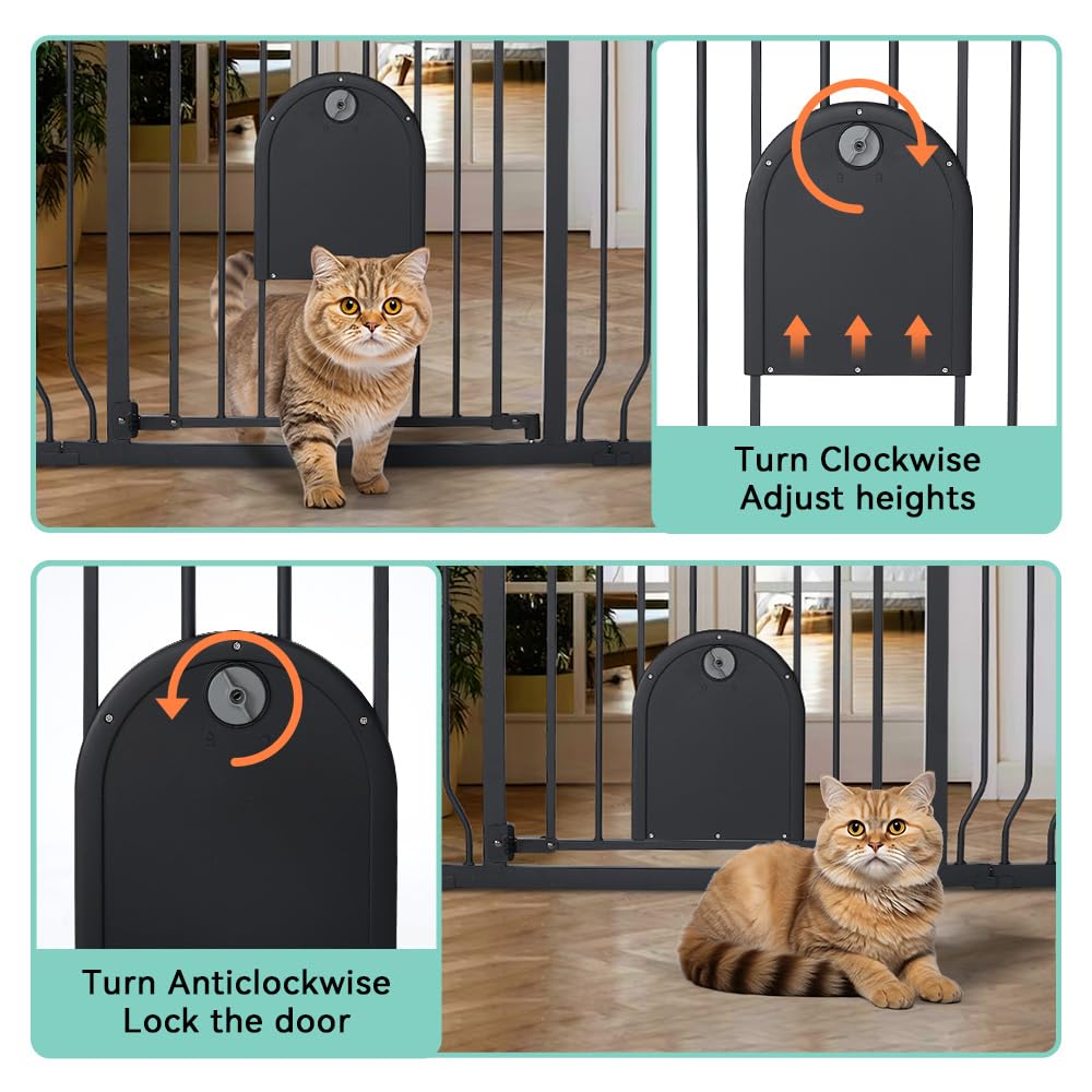 ["76cm High x 123cm Wide: Fits openings from 75cm to 123cm, suitable for doorways, hallways, and stairs in your home and garden. With a height of 76cm, no need to worry about pets/babies crossing the gate. Note: Please measure your openings before purchasing to ensure the right fit.","Pet Sliding Door: The built-in pet gate measures 22.6cm x 26.9cm and can be locked/unlocked with the knob. Adjust the opening size to fit your pet, allowing them to come and go freely while keeping your baby in a safe area.","One-Hand Operation: Easily open the dog gate with a cat door by lifting the buckle when your hands are full or carrying your baby. The child safety door automatically closes at less than 90°. To keep the door open, simply open it to 90°.","Double Locking Mechanism: The lock has a snap closure with upper and lower structures that need to be lifted for full unlock, preventing curious babies and clever pets from opening the baby gate with a cat door. The enhanced extra-wide baby gate has an anti-pinch pivoting design to avoid trapping risks.","Effortless Installation: Two mounting options available: pressure-mounted or drilling. This stair guard is easy to install and remove, taking just a few minutes to set up."]