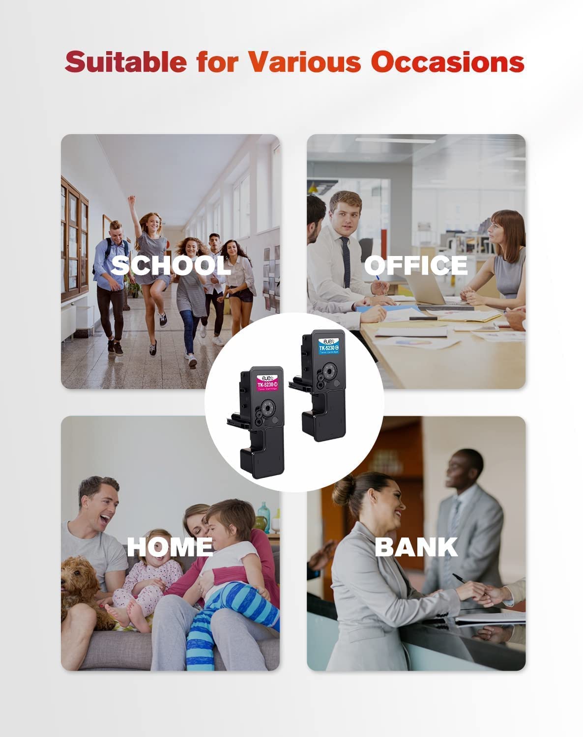 "ejet 4-Pack TK5230 Compatible Replacement for Kyocera TK-5230K, TK-5230C, TK-5230M, TK-5230Y Toner Cartridges","Compatible with the following printer models: Kyocera ECOSYS P5021cdn P5021cdw M5521cdn M5521cdw","Estimated page yield: 2600 pages (Black toner) and 2200 pages (Color toner) A4 at 5% coverage","Package contents: 1 Black / 1 Cyan / 1 Magenta / 1 Yellow Toner Cartridges (non-Original)","Our TK5230 toner cartridges deliver print quality and ensure vibrant prints"
