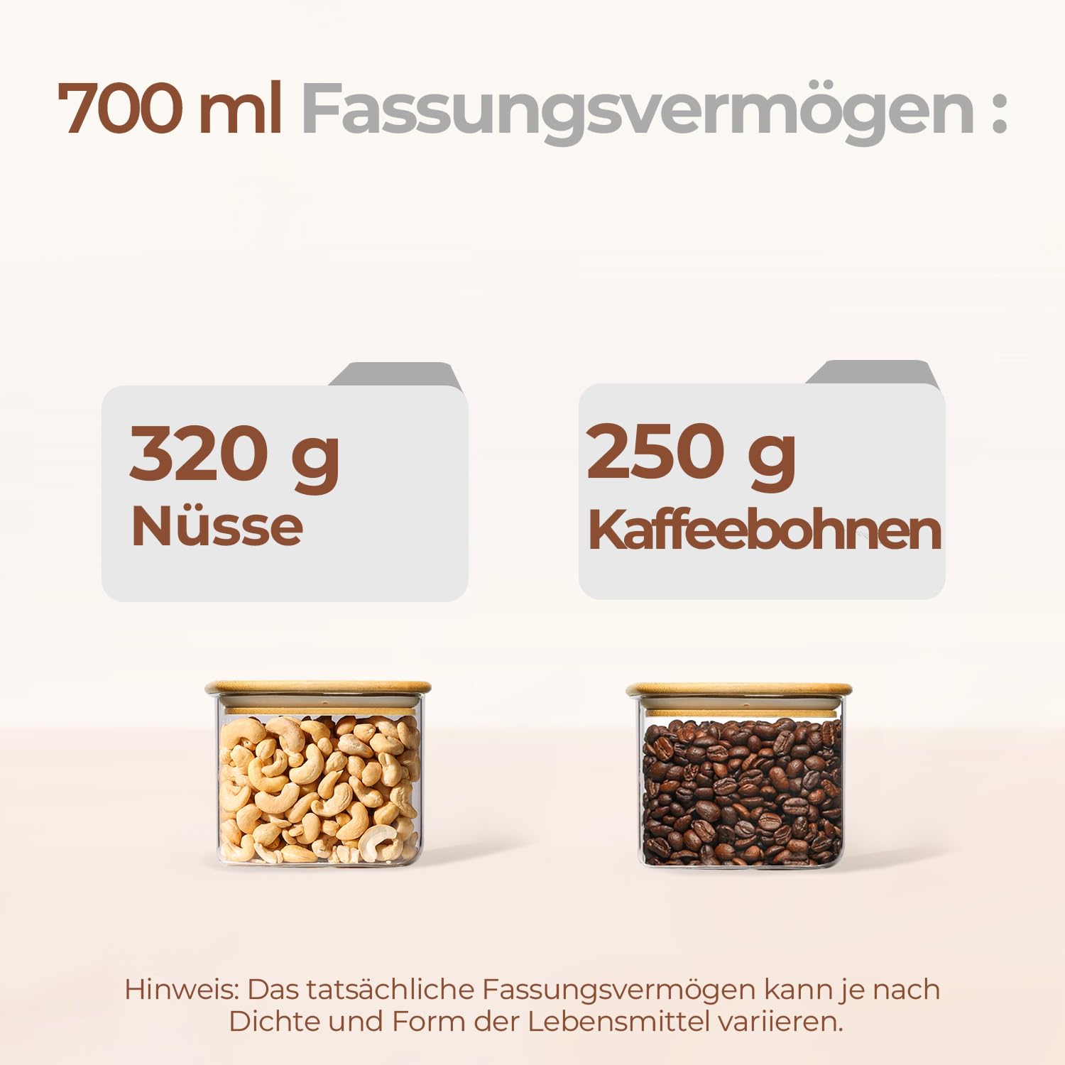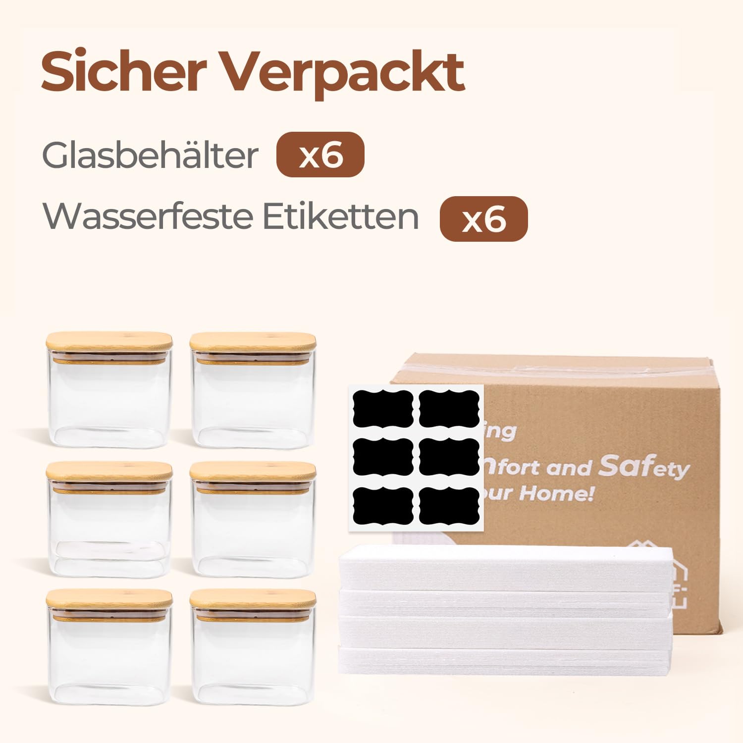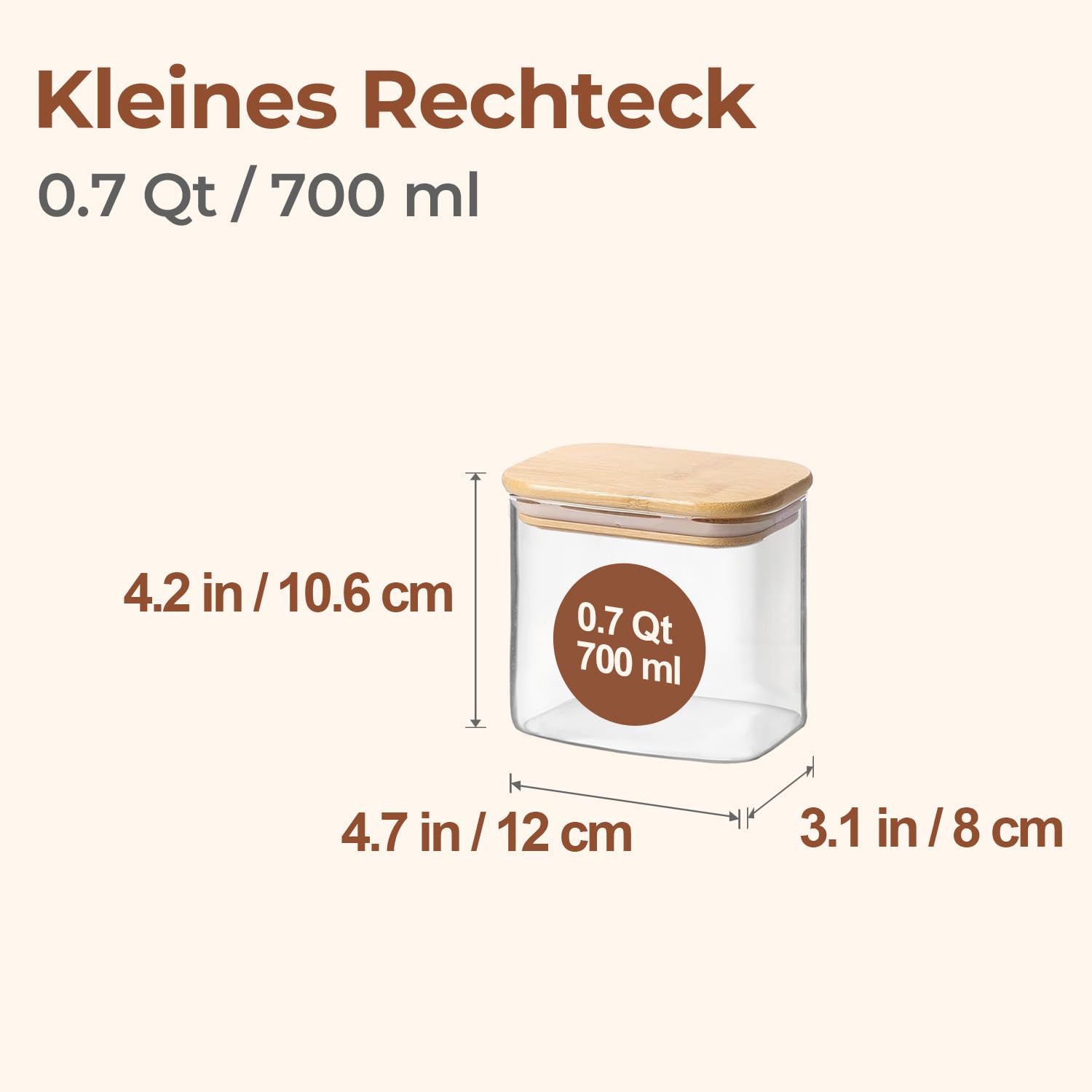 【Perfect size for division】The set consists of meal prep glass jars 700ml x 6, storage jar size 12cm x 8cm x 10.8cm (L x W x H) and comes with free labels. These glass storage jars with lids are perfect for storing tea, sugar, spice jars, spaghetti, cereals and other foods, making them a perfect housewarming gift.