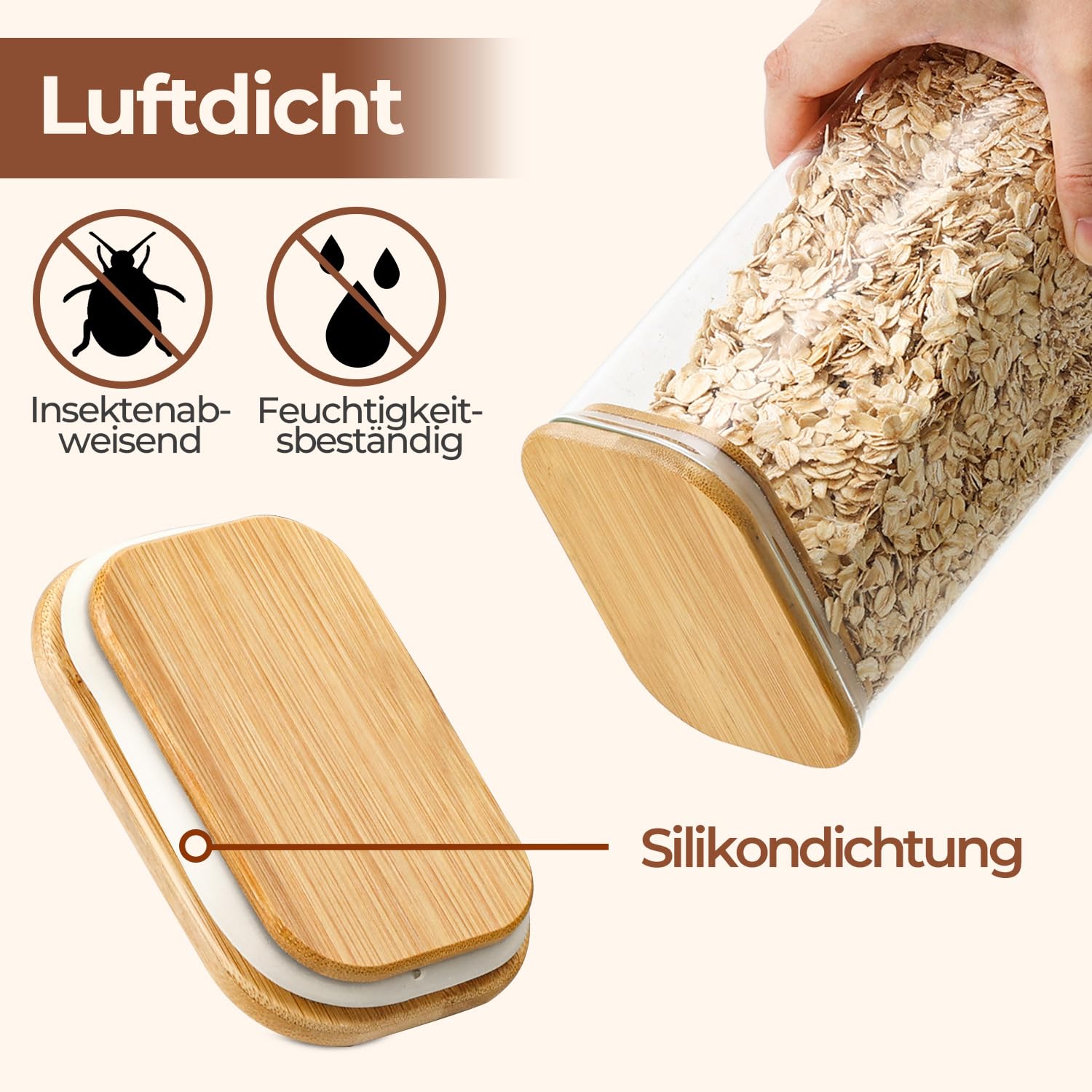 【High air tightness】The airtight glass jars with lids are equipped with a bamboo lid and a silicone sealing ring to ensure better sealing. This high square glass storage jars extend the freshness and shelf life of food. Various sizes of glass containers are available to meet your storage needs in the kitchen and keep them clean and tidy.