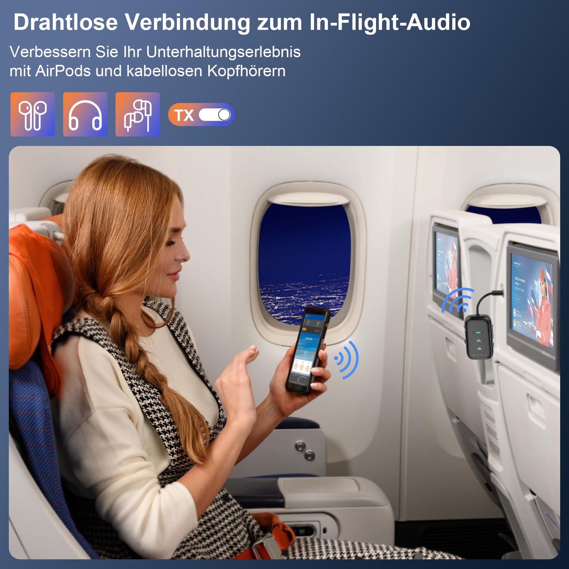 Easy to use: Enjoy uninterrupted sound for over 28 hours on a single charge, perfect for long flights. Additionally, the adapter's TP-C charging port features overvoltage protection for added convenience and safety. The Bluetooth transmitter has an LED charging indicator to keep you informed of the battery level.