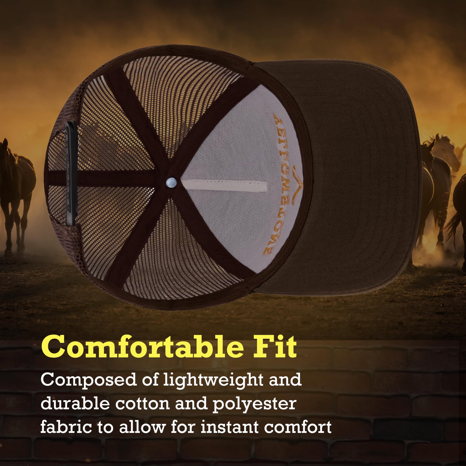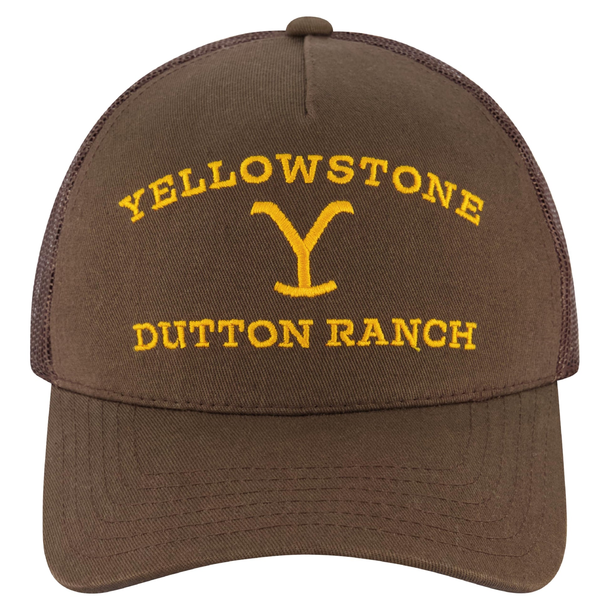 ["Yellowstone Yellow Stone Baseball Cap: Stylish brown Yellowstone fully adjustable mesh baseball hat with embroidered Dutton Ranch logo on the front","One size fits all: The snapback hat features an adjustable snapback closure on the back of the ball cap to provide a comfortable fit on adult men and women of all shapes and sizes","Lightweight and durable: The adjustable hat is made of lightweight and durable cotton and polyester fabric for instant comfort when worn. The trucker cap features a curved brim with stitching to prevent UV rays from the sun from reaching your eyes","Officially licensed product: These trucker hats are officially licensed Yellowstone apparel, so you know you are getting high-quality goods","Hand wash only: Soft caps are recommended for hand washing only, lay flat to dry, do not iron"]