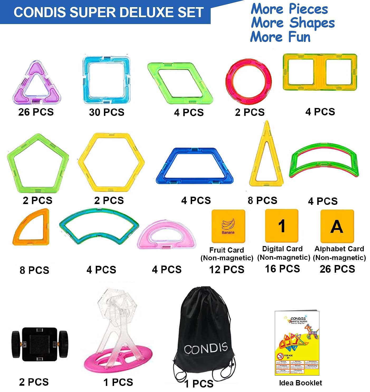 ["Educational STEM toy for kids aged 3 and up: Promote your child's logical thinking, attention, motor skills, imagination, and cognitive learning! With these magnetic building blocks in various shapes, children can build two-dimensional and three-dimensional structures like castles, vehicles, animals, and Ferris wheels. Perfect for family time, kindergarten, school, and more","Compatible with other brands: The basic square Condis blocks have a side length of 2.5 inches, the basic triangle blocks are 2.1 inches. These industry standard sizes ensure compatibility with other major brands. The strong magnets provide more stable constructions, boosting children's confidence and sparking their imagination and interest to explore and build more, bigger, and more interesting creations","Safety comes first: Condis magnetic building blocks are made of safe and durable, food-grade ABS plastic. The surface is smooth and the edges are rounded to prevent scratching or injuring small hands. The magnets are fully enclosed, the structure is stable and not easily breakable. The standard sizes prevent children from swallowing them. Easy to clean and reusable","The perfect educational toy gift: This is a fantastic learning toy for toddlers aged 3 and up, preschoolers, and school-age children. Even teenage boys and girls love it! It's the perfect gift for birthdays, Children's Day, kindergarten, graduations, Christmas, and other holidays","Complete set of building blocks for fun/ 160 pieces: Super high value. 26 triangles, 30 squares, 4 isosceles trapezoids, 8 isosceles triangles, 4 diamonds, 2 pentagons, 2 hexagons, 2 round shapes, 4 semicircles, 8 right angle sectors, 4 double squares, 4 arches, 4 window shapes, 12 fruit cards (non-magnetic), 26 letter cards (non-magnetic), 16 number cards (non-magnetic), 1 Ferris wheel, 2 wheels, and 1 carrying bag. The included portable bag makes for easy clean-up and storage"]