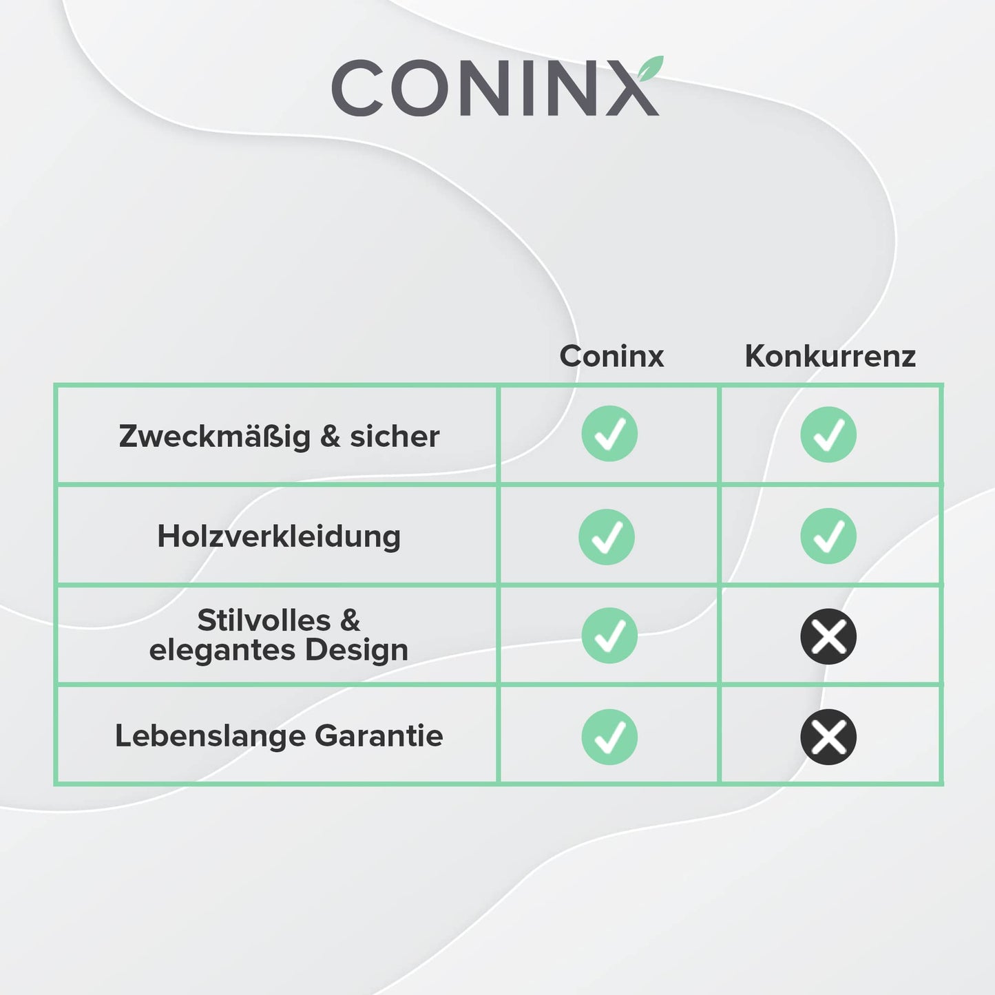 ["15 knife slots: 15 different-sized knife slots provide enough space for all your favorite steak knives, chef's knives, bread knives, and other kitchen knives. The empty knife block also includes a large slot for your kitchen shears.","ROBUST WOOD DESIGN: Our wooden knife block is carved from extremely strong acacia wood, making it particularly durable. Additionally, the wooden knife block is easy to clean in case your kitchen regularly resembles a battlefield after cooking.","NON-SLIP RUBBER FEET: Knife blocks that slide around can be dangerous. That's why our kitchen knife block is equipped with rubber feet to prevent slipping and sliding. Safety first!","GREAT GIFT FOR HOME COOKS: With their elegant look and universal compatibility, our knife blocks are a great gift idea for cooking enthusiasts, housewarmings, weddings, and more.","GREAT VALUE FOR MONEY: Coninx stands for high-quality kitchen products. The universal knife block stands out for its premium materials and excellent craftsmanship. See for yourself!"]