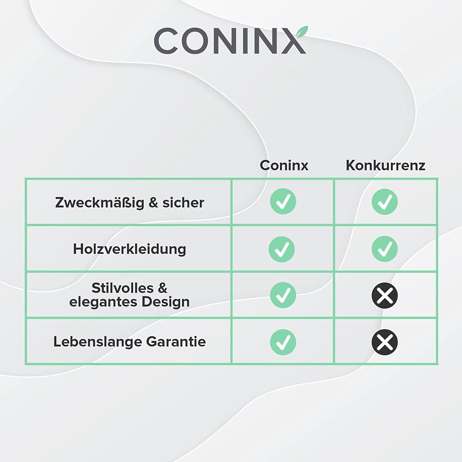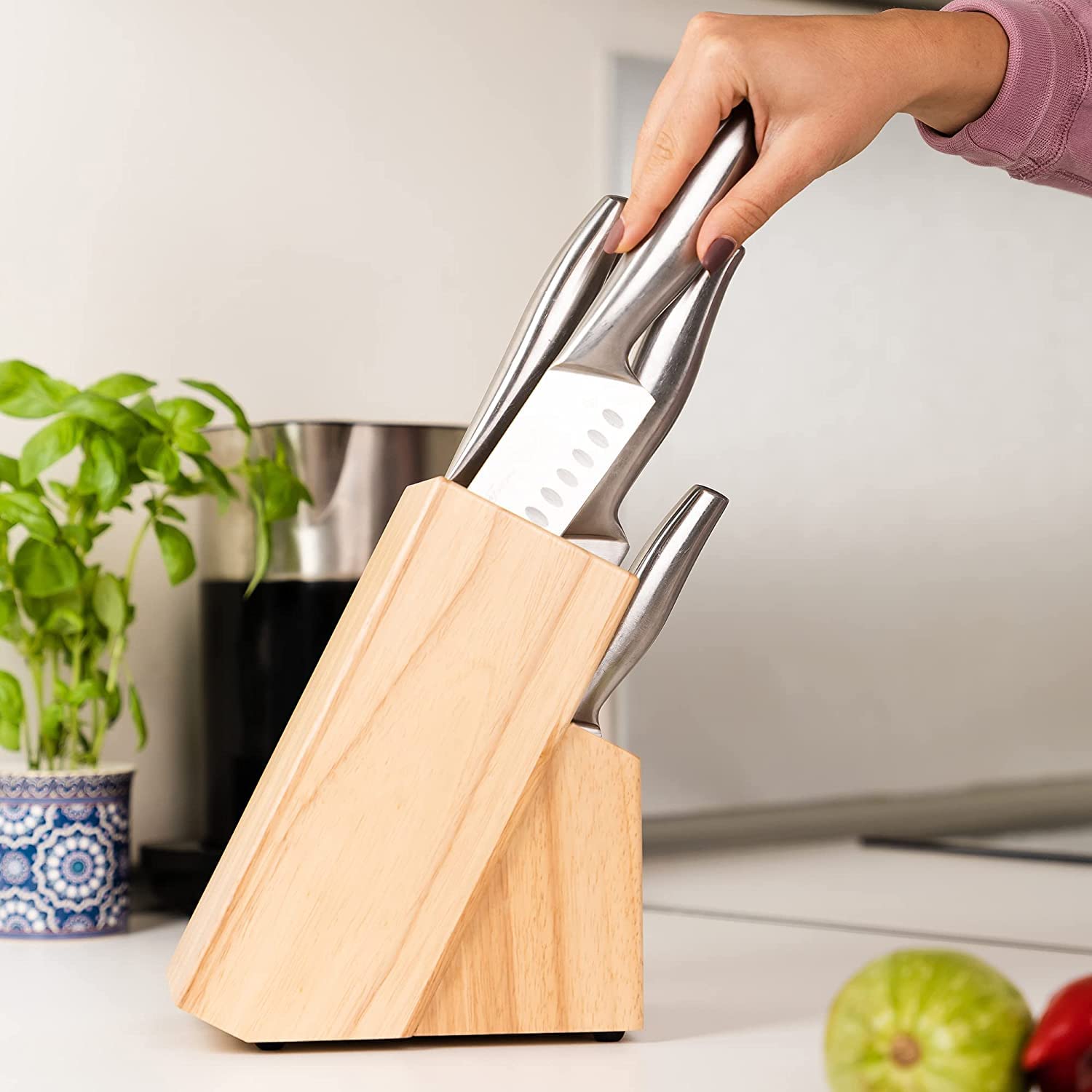 ["15 KNIFE SLOTS: 15 different sized knife slots provide enough space for all your favorite steak knives, slicing knives, bread knives, and other kitchen knives. The empty knife block also includes a large slot for your kitchen shears.","STURDY WOOD DESIGN: Our wooden knife block is carved from extremely strong rubberwood, making it particularly robust. Additionally, the wood knife block is easy to clean in case your kitchen regularly looks like a battlefield after cooking.","NON-SLIP RUBBER FEET: Knife blocks that slip can be dangerous. That's why our Kitchen Knife Block comes with rubber feet that prevent slipping and sliding. Safety comes first!","GREAT GIFT FOR HOME COOKS: With its elegant appearance and universal compatibility, our knife blocks are a great gift idea for cooking enthusiasts, housewarmings, weddings, and more.","GREAT VALUE FOR MONEY: Coninx stands for high-quality kitchen products. The universal knife block stands out for its premium materials and excellent craftsmanship. See for yourself!"]