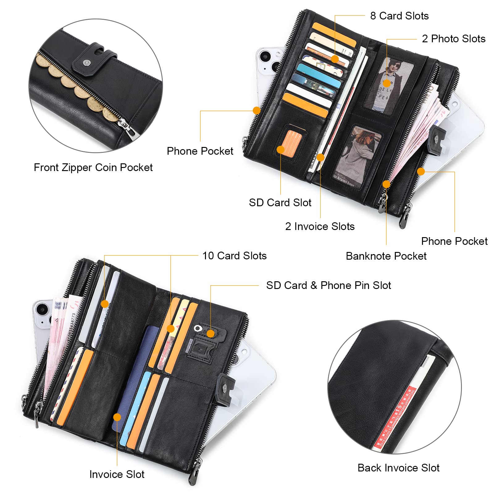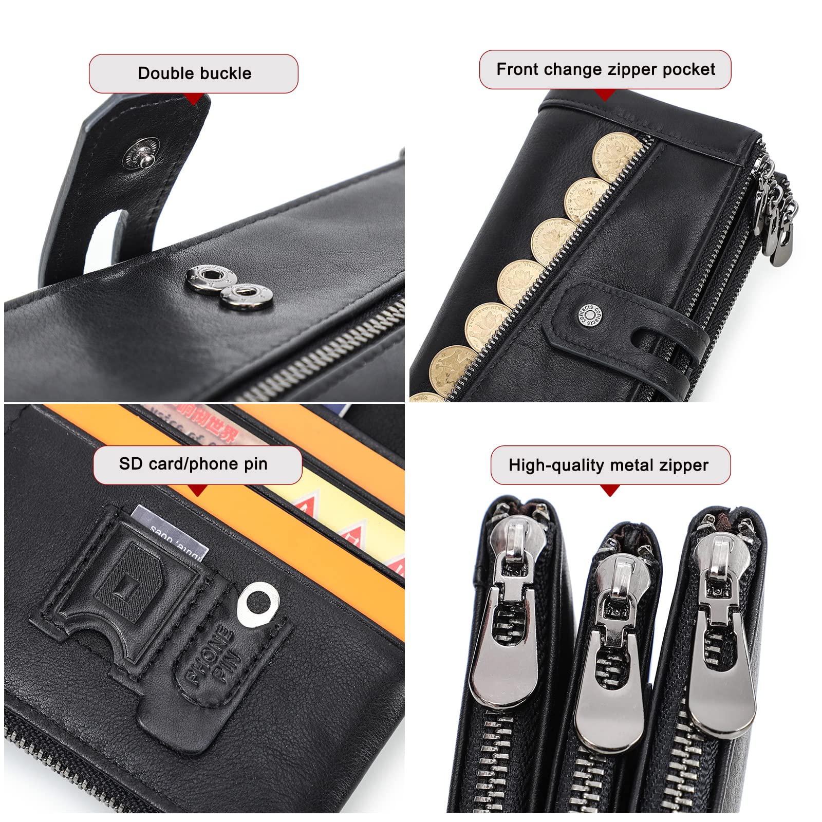 Women's wallet with snap button and zipper made of genuine leather; The lining is polyester; The zipper is very well made, fine lining, precision hand stitching for cars; Size: 3.75" x 7.5" x 1" inches; Clutch Wallet is suitable for both casual and business occasions; On the front, there are 1 small coin pocket with zipper, 2 mesh ID windows, 18 card slots, 3 extra oversized compartments for receipts, bills, cash, 1 SIM/SD card slot; 3 zipper pockets can accommodate banknotes, larger bills, checkbook, mobile phone, iPhone 8; The back has 1 long slot for a bill, receipt; 【RFID signals block】 Our large capacity wallet is equipped with advanced RDIF-blocking technology that can effectively prevent illegal electronic signals from scanning your credit card to protect your identity.