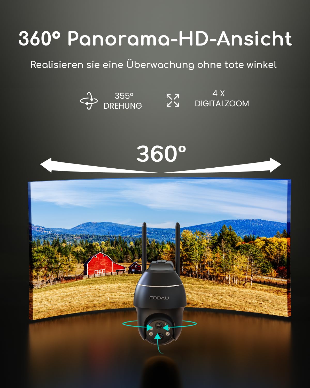 ["No WiFi required! No power cable needed! Break free from the distance limitations of traditional WiFi cameras with the COOAU 4G LTE outdoor surveillance camera, perfect for areas with no WiFi or weak signal. The included 5W solar panel ensures the camera is always charged, and with the built-in 10,000mAh battery, no power outlet is needed. Easy installation features and waterproof IP66 material make the 4G camera ideal for rural homes, construction sites, farms, ranches, vacation homes, RVs, and other outdoor locations. (WiFi connection not supported)"],["4G LTE · Unlimited Data · More Stable Communication Quality COOAU introduces an unlimited data plan for the first time, allowing you to use the camera freely without being restricted by data exhaustion. The solar surveillance camera comes with a COOAU SIM card (already inserted) with 7 days of free unlimited streaming. After the trial period, you only need to spend 7.99 euros per month in the app to get unlimited data (it is equally affordable with an annual subscription, 6.6 euros per month, no need to recharge within a year)"],["2K Ultra HD · 360° Full Coverage The 2K 4G outdoor surveillance camera with SIM card comes equipped with an optical 3-megapixel lens and 4 spotlights that can differentiate between animals and humans (person detection), recording clearly day or night. With a stable 4G network, 355° pan, 90° tilt, and 4x digital zoom, you can remotely access surveillance cameras on your mobile phone even when you're away, quickly get an overview of the situation on site, activate alarms instantly, and protect your property from intrusion and destruction."],["Smart AI Detection · Comes with a 64GB Memory Card · Record Important Events The surveillance camera without WiFi features functions like person detection, motion detection, and custom area detection, reducing false alarms by 95%. When the outdoor surveillance camera detects the motion of a person or animal, a warning will appear immediately, allowing you to receive notifications on business trips in a timely manner. Alarm recordings are stored on the built-in 64GB memory card, and the alarm content can be viewed anytime through the app."],["Response within 24 hours · Professional Support · Worry-Free Camera Use If you have any questions during the installation, connection, or use of the COOAU 4G camera, you can contact us via COOAU's official email or directly through Amazon or the COOAU Cam APP. We offer professional after-sales support within 24 hours to solve any issues and provide you with a worry-free shopping experience." ]