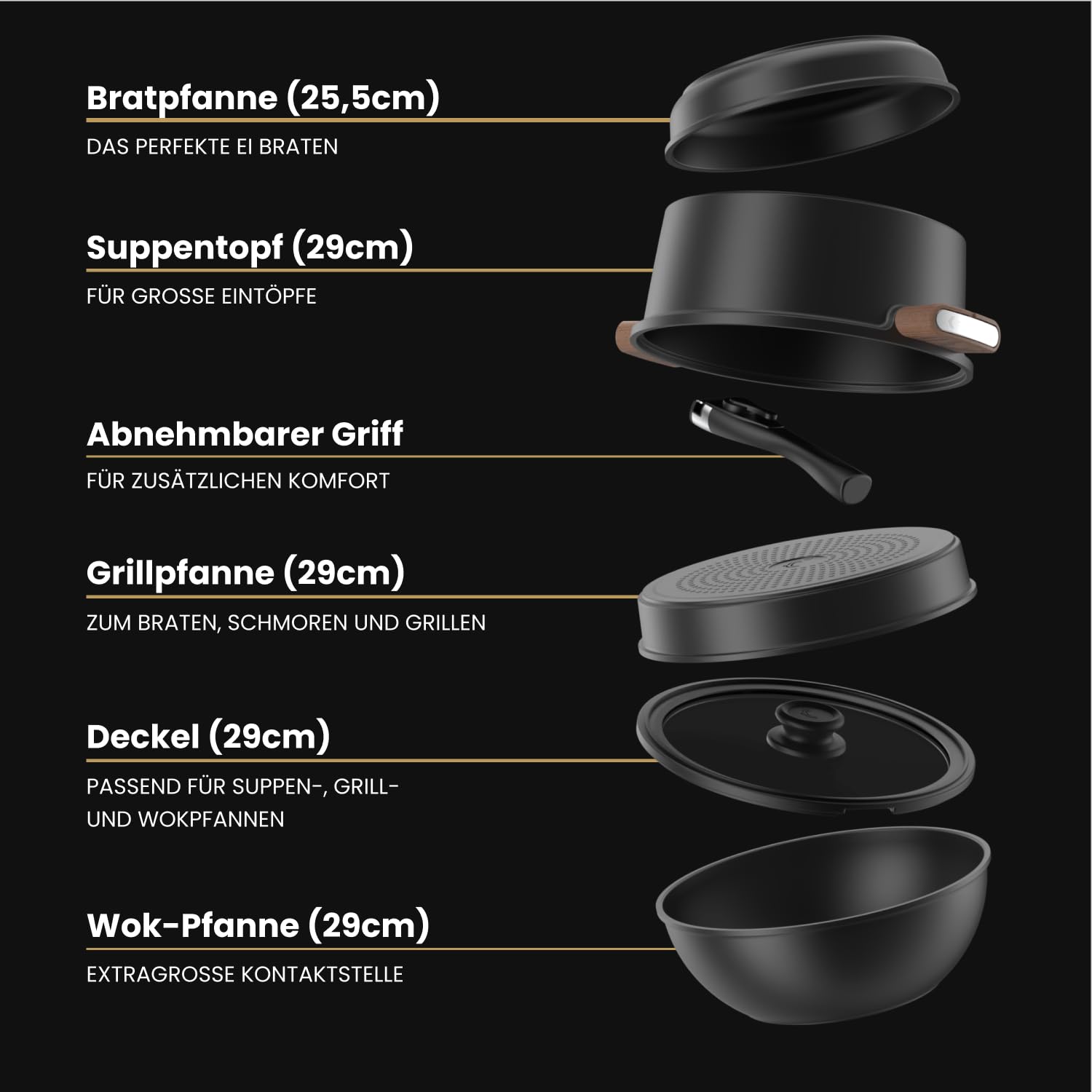 ["6-piece Ceramic Cookware Set: The cookware set includes 1 x Frying Pan (10 inches), 1 x Stockpot (11.5 inches/6.1 qt), 1 x Grill Pan (11.5 inches/2.5 qt), 1 x Wok Pan (11.5 inches/4.8 qt), 1 x detachable handle, 1 x large glass lid with silicone rim (11.5 inches). Detachable handles suitable for each pan.","Stackable and space-saving: The CookingTotem stackable cookware set is specially designed to efficiently utilize your kitchen space. The innovative stackable design saves up to 75% more valuable space in your kitchen cabinets and looks beautiful on the countertop.","Safe non-stick coating: Our ceramic coating is made using Sol-Gel technology, using inorganic components. It is LFGB approved and 100% free of PFAS, PFOA, lead, and cadmium. This thick and durable non-stick coating lasts up to 2.5 times longer than traditional non-stick pans.","Pans are oven-safe up to a temperature of 220℃, excluding lid, handles, and stockpot. The heat-resistant handles poorly conduct heat, keeping cool during use. The aluminum base with advanced technology ensures fast heating.","Patented detachable handle: Carrying capacity up to 10 kg for effortless moving between stove, oven, table, and fridge. The detachable handle is ideal for preparing dishes in the oven. Pans are oven-safe up to 220℃ (excluding handle, lid, and stockpot). By removing the detachable Stay Cool handle, the pans transform into beautiful serving dishes.","Oven and dishwasher safe: The pans have a 4.5mm extra thick aluminum base, ensuring fast and even heating. The CookingTotem is suitable for gas, oven, dishwasher, electric, ceramic, halogen, and induction cooktops.","Dutch Design: The patented stackable design has won several design awards, including the IF Design Award and the Red Dot Design Award.","Lifetime satisfaction guarantee: We are confident that you will love the quality of our cookware set. However, if it arrives damaged, becomes faulty, or is not completely satisfying for any reason, simply contact us. We offer a hassle-free full refund or replacement. Your comfort and satisfaction are our top priority."]