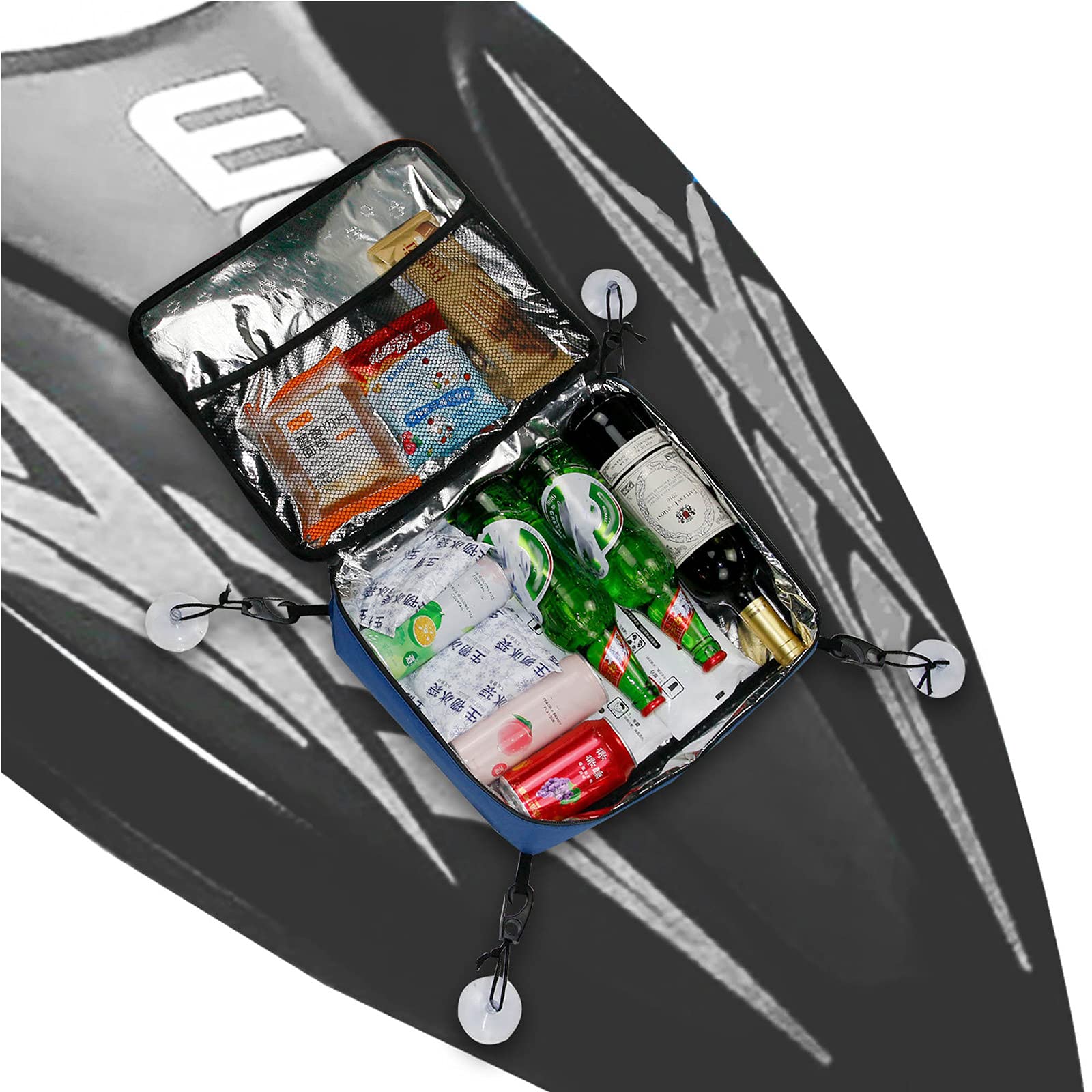 SUP Deck Cooler Bag: High-density 600D Oxford fabric outer layer, super thick pearl cotton insulation foam and PVC insulation inner layer. Keeps food and drinks cool.