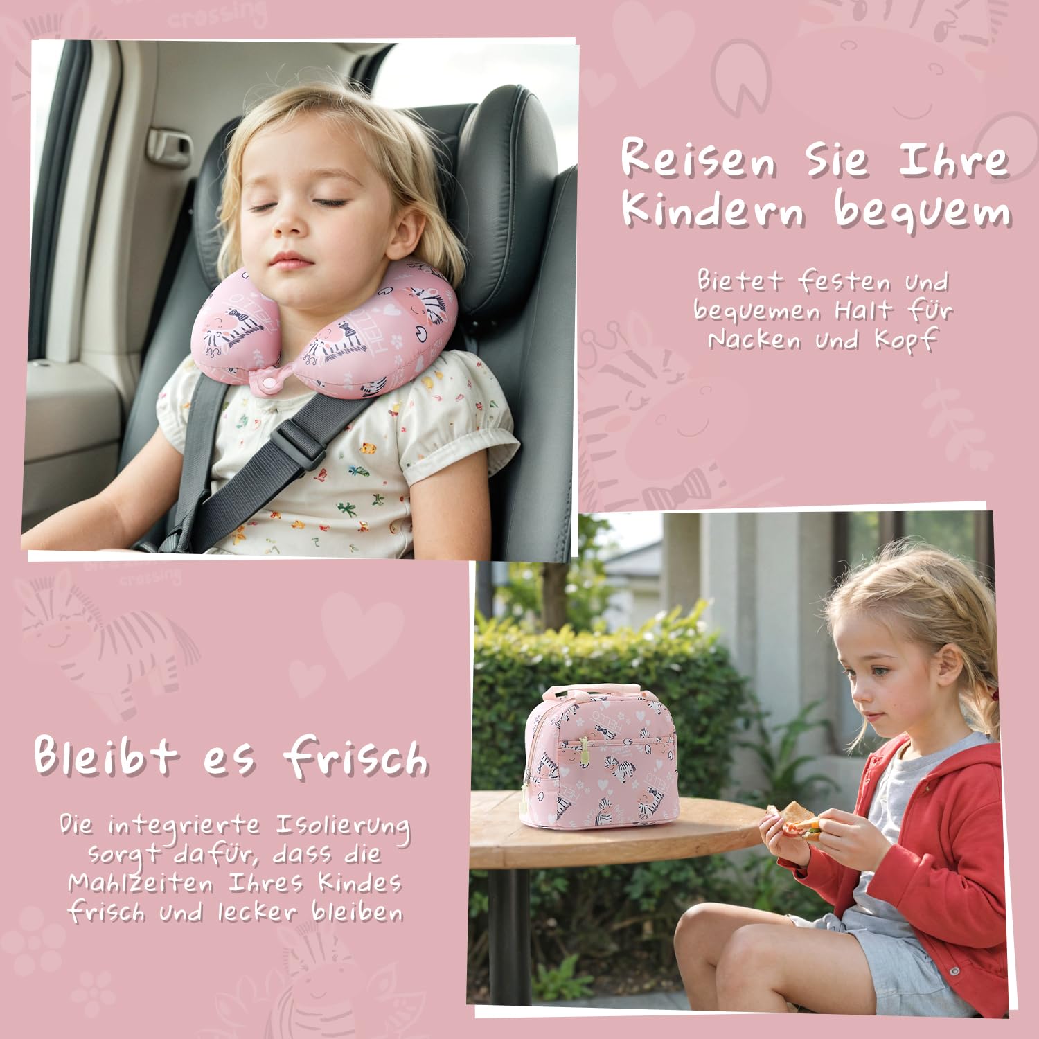 ["5-piece Kids Luggage Set: Make this adorable kids travel set a cheerful travel companion for your child. This luggage set includes 1 x 16" kids suitcase, 1 x 14" backpack, 1 x 10" lunch bag, 1 x neck pillow, 1 x luggage tag.", "The kids suitcase is made of high-quality ABS material, lightweight, sturdy, and durable, standing up well to bumps during transport. There are no sharp corners on the edges of the suitcase to ensure that children are not injured during use. The surface of the suitcase is waterproof and not easily dirtied. You can clean the surface directly with a damp cloth.", "The interior of the kids suitcase is equipped with luggage straps and zipper compartments. The interior is spacious, perfect for storing children's items. Smooth swivel wheels and telescopic handles make it easy for children to push and pull the suitcase, making it ideal for travel. There is also a matching luggage tag that is easy to spot on the suitcase and always has important information at hand.", "The backpack features adjustable shoulder straps to fit children of different sizes. The interior of the backpack is equipped with multiple compartments and pockets, providing ample space for your child's school supplies, toys, and personal belongings. The pockets on both sides are equipped with reflective strips to improve visibility at night and ensure your child's personal safety.", "The kids luggage set also includes a lunch bag that can be used on long trips or in daily life. This lunch bag has integrated insulation to keep your child's meals fresh, and zippered compartments ensure that nothing spills or leaks. For added convenience, it even has an additional side pocket for utensils or napkins.", "The neck pillow is made of high-quality fabric, feels soft, and provides firm and comfortable support for your child's neck and head. It promotes the health of your child's cervical spine and is suitable for long trips or daily use such as reading, watching TV, or simply relaxing."]