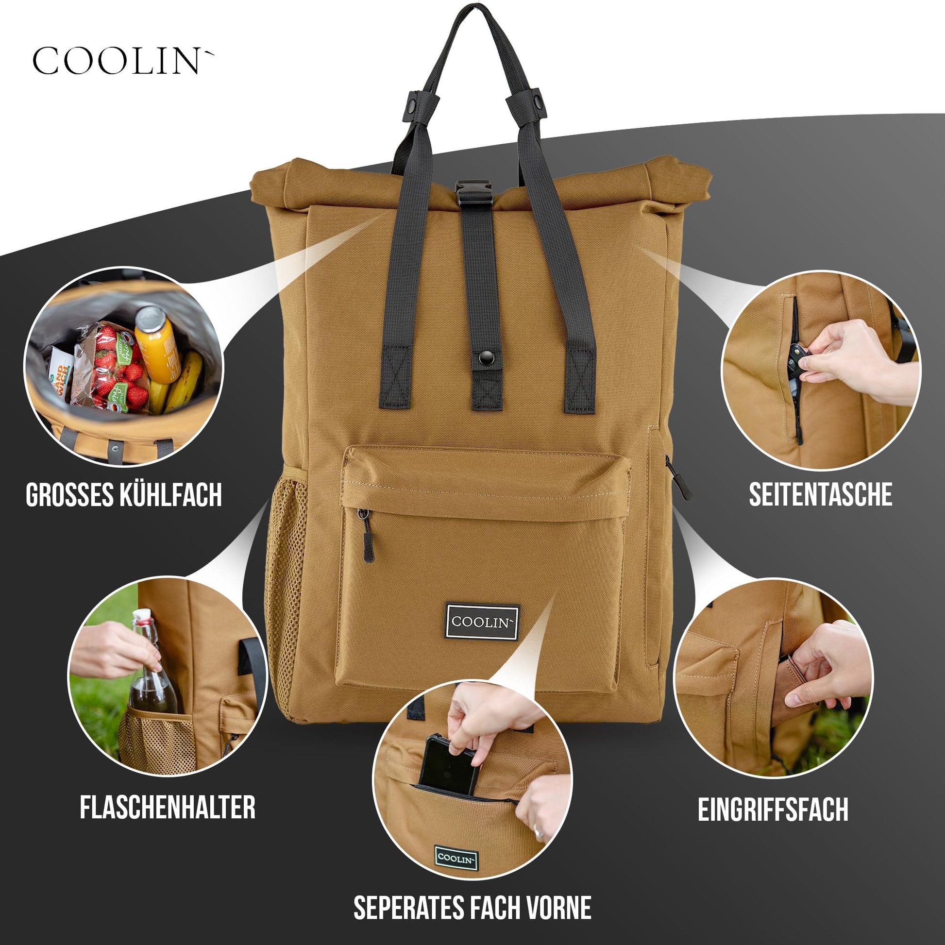 ["πΓπππππππππ πππππ πππππππ - say hello to your new cooler backpack! From now on, you can conveniently transport your drinks & food in the backpack. Simply put in a cooling pack and you're good to go!","ππππππππ πΓπππ & πΓπππ! You can also use your backpack without cooling packs. However, your food is insulated inside. This means that you can keep fresh food warm on the way home or keep the frozen pizza cold after shopping!","πππ πΓπππππππππππ! Unlike conventional cool bags, your new cooler backpack is really comfortable. With the soft back padding, the backpack sits comfortably on your back and shoulders, making every trip a pleasure!","πππ ππππππππ πππππππππ: The backpack is also ideal for everyday use. Especially in summer, it's nice to have the inside of the backpack stay cool and fresh. Thanks to its modern & casual look, you can take your new cooler backpack to uni or work!","π