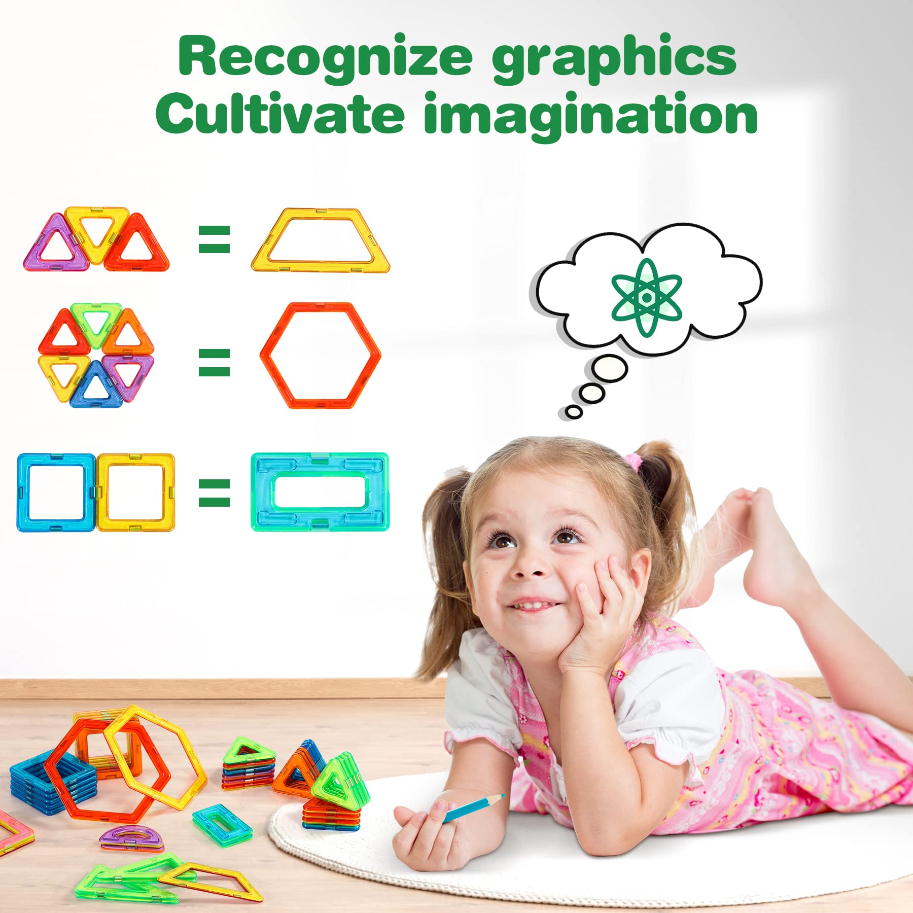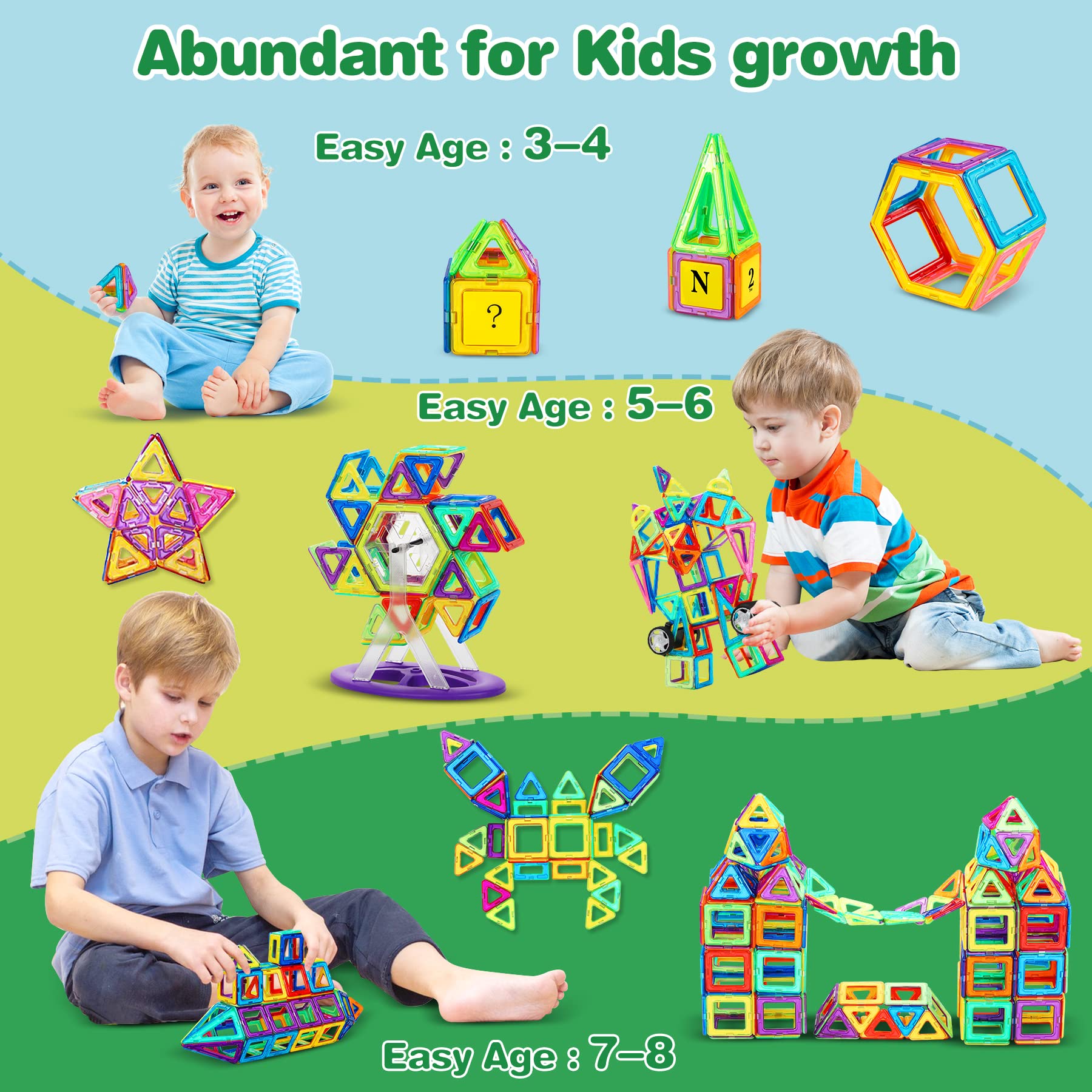 ["Learning in magnetic building blocks: Bright color blocks attract the eye, enhance children's cognitive skills with magnetic blocks, 2D to 3D spatial thinking, exchange new ideas, and provide children with a magnetic volume in a meaningful way. Have fun."]