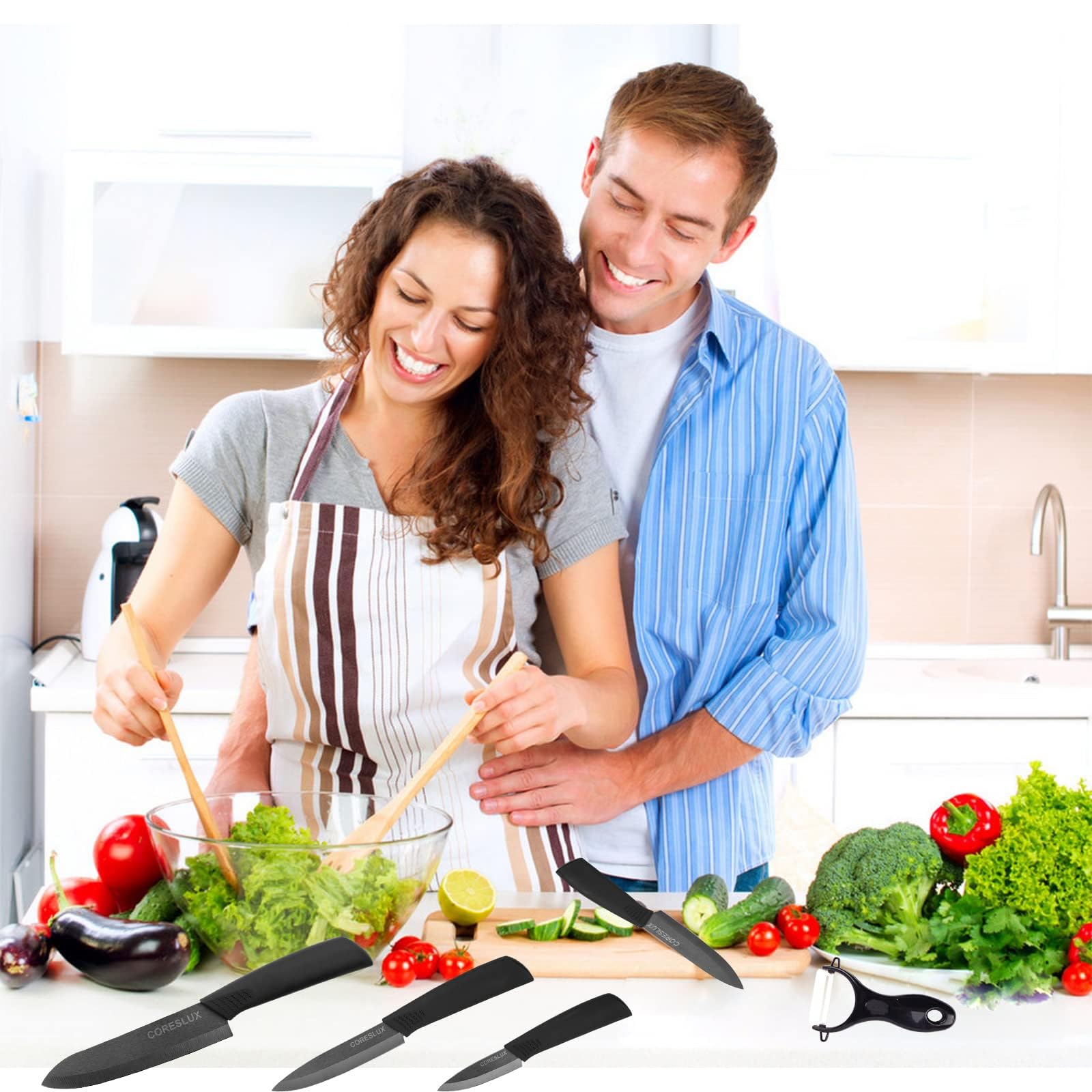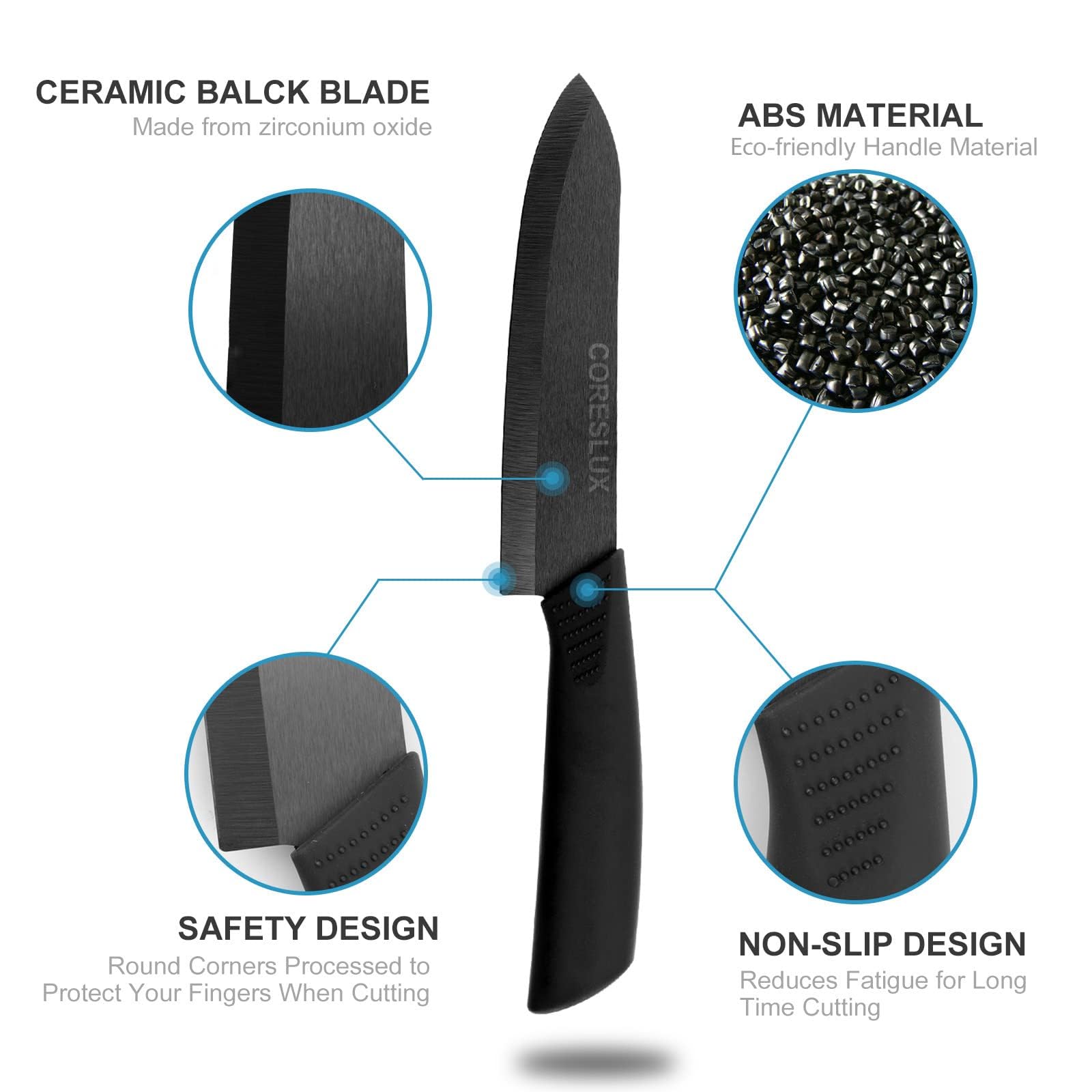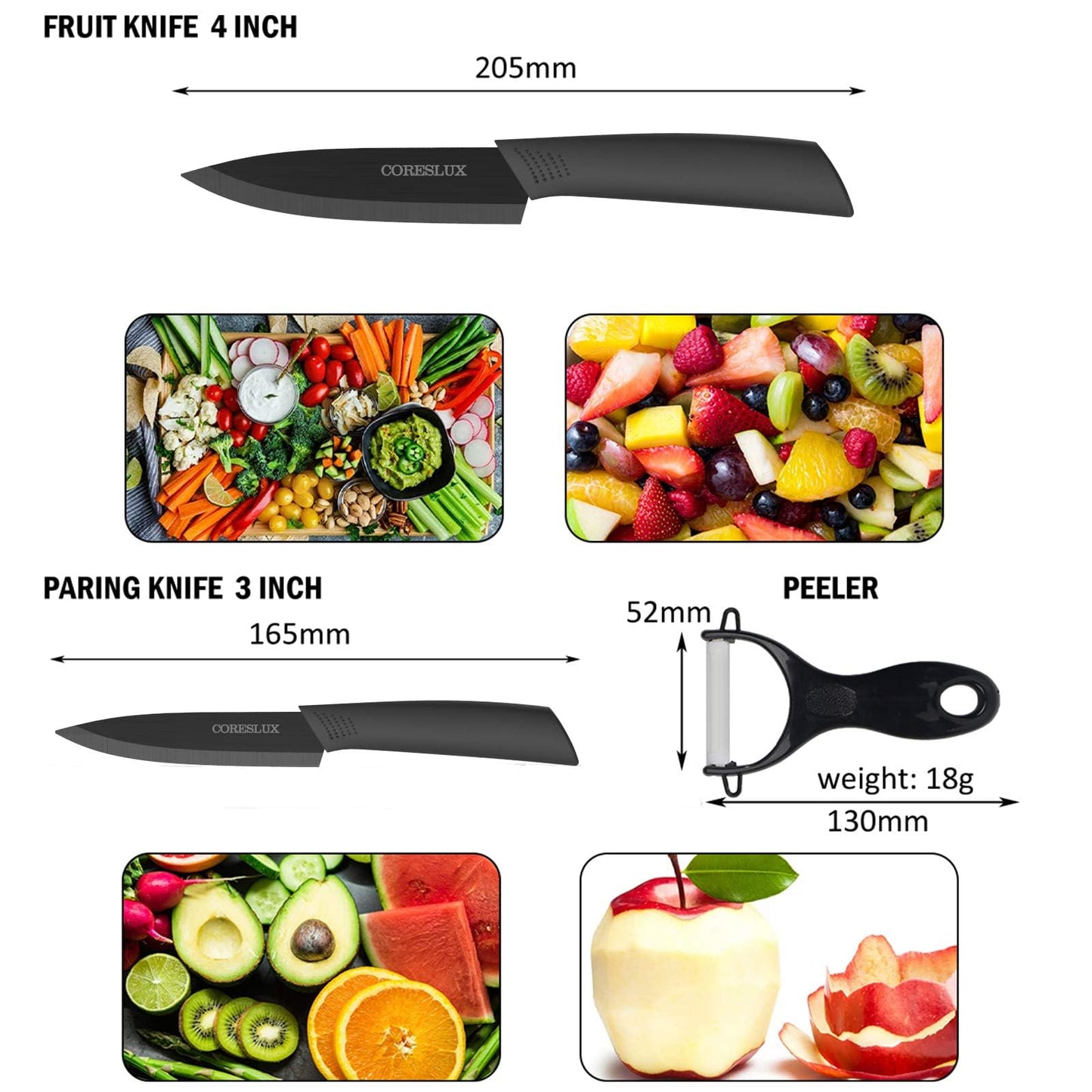 CORESLUX Ceramic Knife Set, 4 Ceramic Kitchen Knives with 1 Peeler, Non-Stick Coating, Sharp, Chef Knife, Ceramic Knife Set for Cutting Fruits Vegetables Meat (Black)