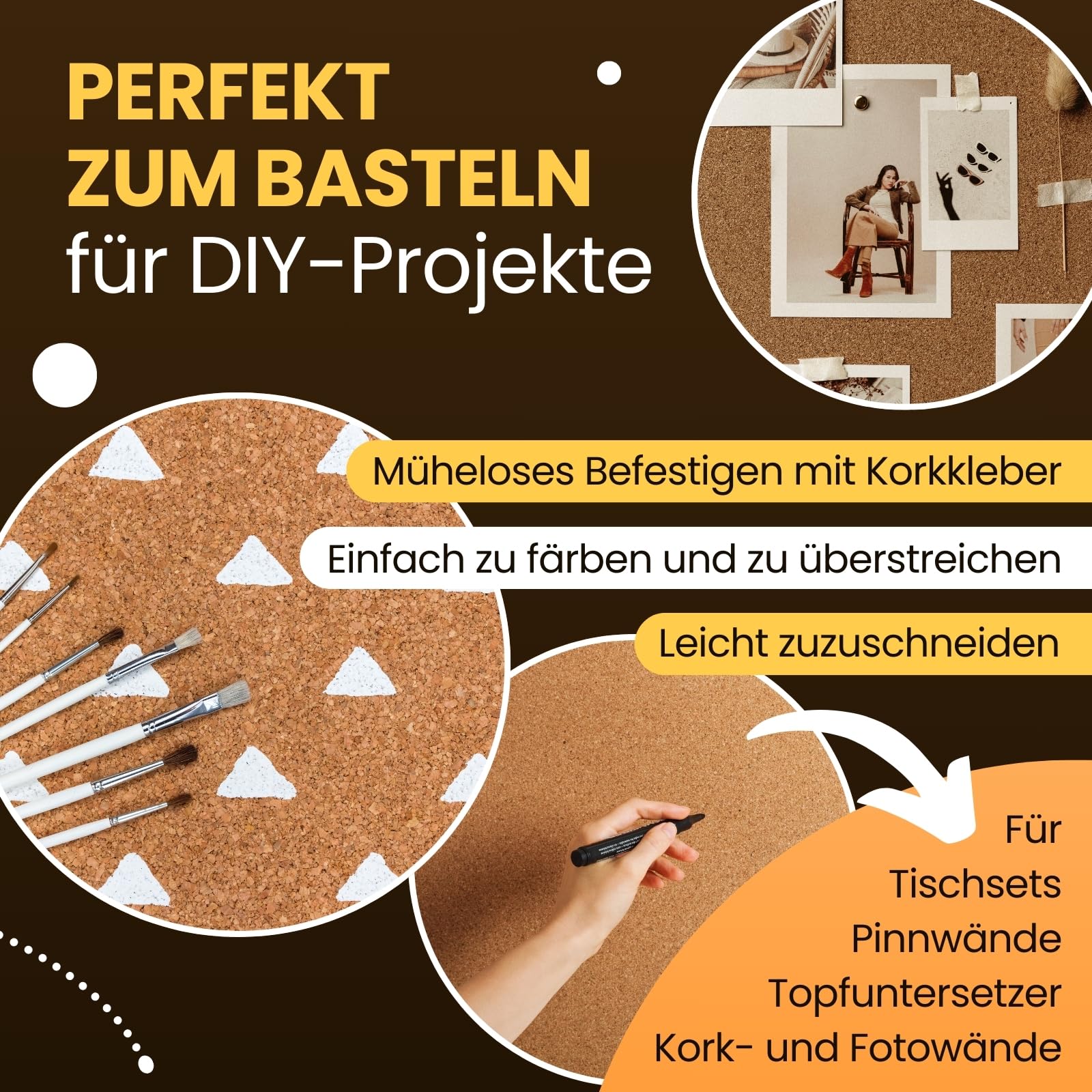 "LARGE FORMAT - With a size of 100 x 50 cm, the durable & non-slip cork board provides enough space for all your projects. It can be easily cut & fixed with cork glue.",