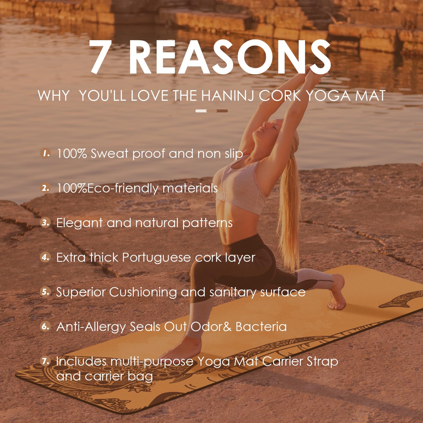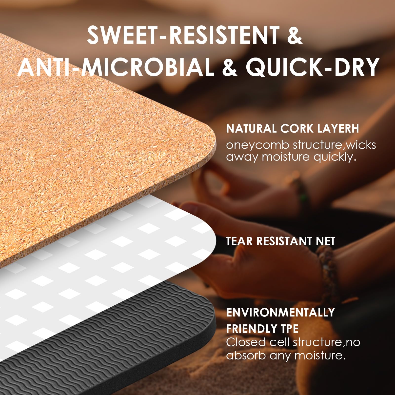 ["4 mm Yoga Mat】Environmentally friendly 100% natural cork surface + recyclable and biodegradable black TPE foam bottom. Laboratory tested quality, mats are free of harmful substances, no latex, no PVC, non-toxic or any harmful chemicals. Get a healthy yoga mat for yourself.","Dimensions of the yoga mat: approximately 72 x 24 x 0.4 inches (L x W x H). Weight: 2.17 lbs. Lightweight, easy to roll up and with a cotton carrying strap and yoga bag, this exercise mat is the perfect companion for on the go.","Natural Cork Yoga Mat】The combination of Highland wood and environmentally friendly TPE material, which are very durable. Especially on sweaty hands or body, you can grip the cork mat better. Cork contains suberin, a waxy, grippy substance that is released when wet.","Comfortable Yoga Mat】With natural cork surfaces, the exercise yoga mat comes with comfortable cushion spine, hips, knees, and elbows on hard floors to give you a comfortable feeling and a great experience.","Naturally Antimicrobial Fitness Mat】Cork is simply the best surface for your hot yoga and any sweat-inducing exercise. The best choice for beginners, advanced yogis, and yoginis on the go. Also fitness mat for cardio crossfit and pilates." ]