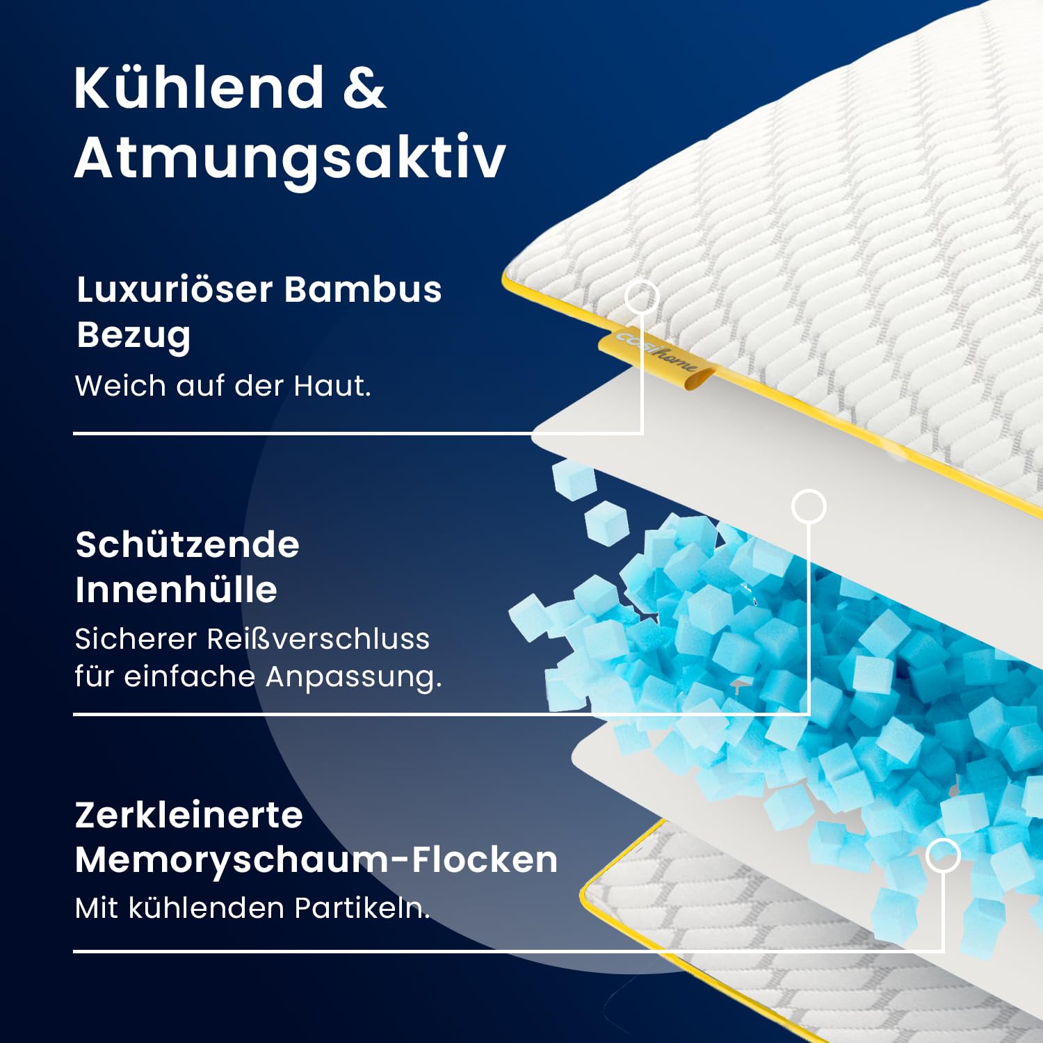 ["The Premium Cosi Home Memory Foam Pillow is filled with ultra-comfortable shredded memory foam that perfectly adapts to you and your sleep, providing optimal support for your neck and head. Dimensions: 28 x 17 inches","Adjustable Height: Thanks to the innovative memory foam filling, the pillow height can be easily adjusted by removing or adding the appropriate amount of memory foam. The sleep pillow comes with a handy storage bag for the excess foam.","Soft & Breathable: The double-sided bamboo pillow is breathable, allowing for optimal air circulation. Temperature-regulating cooling gel particles also prevent excessive heat build-up, ensuring you sleep comfortably cool all night without sweating.","Ergonomic Design: The leading 40D memory foam provides significantly more neck, head, shoulder, and back support than standard 20D pillows, and is also exceptionally durable. This orthopedic pillow efficiently prevents tension and neck pain.","Easy to Care for: The soft bamboo pillowcase is easily removable and machine washable (cold). Please note: Air out the memory foam pillow for about 24 hours after purchase to eliminate any 'new' smell."]