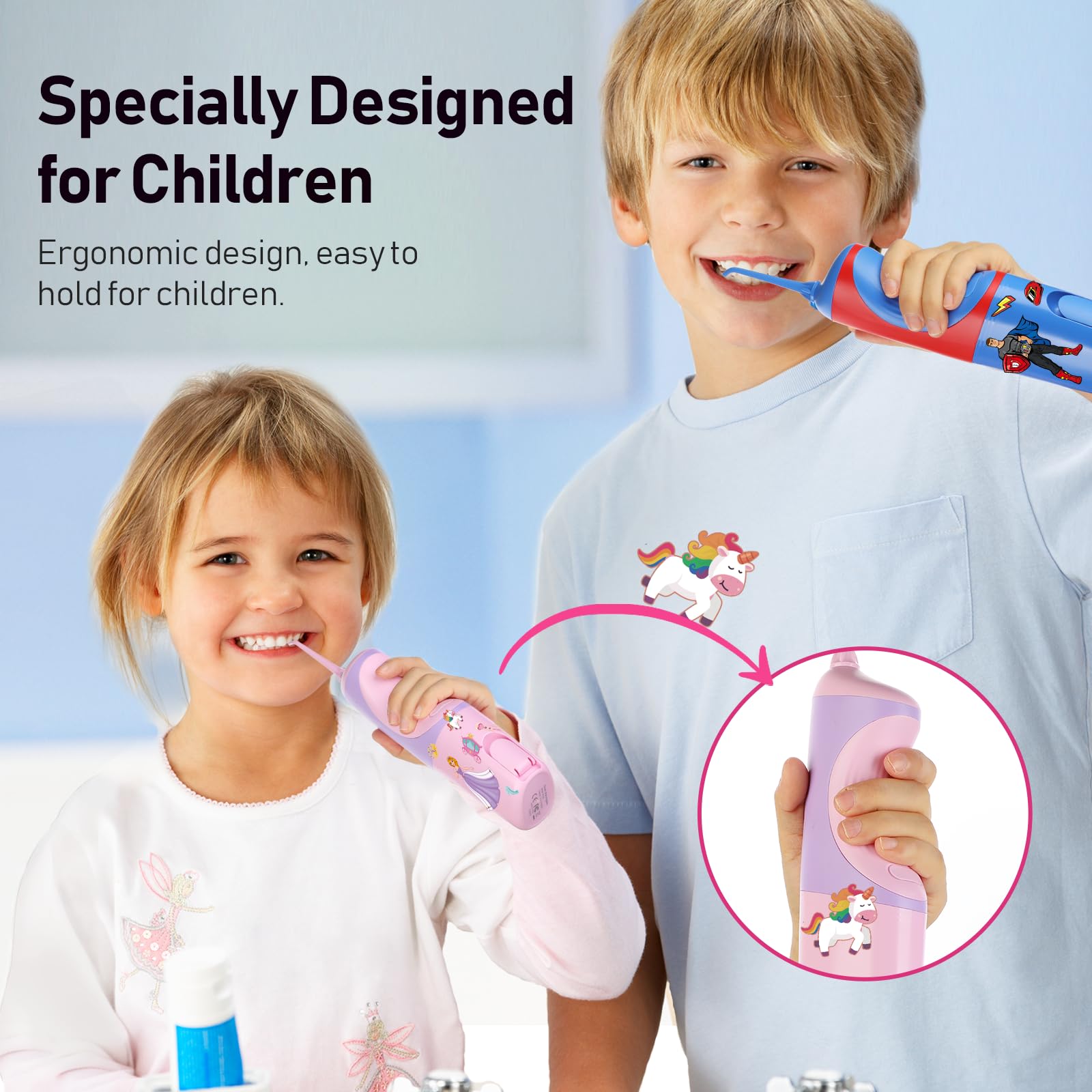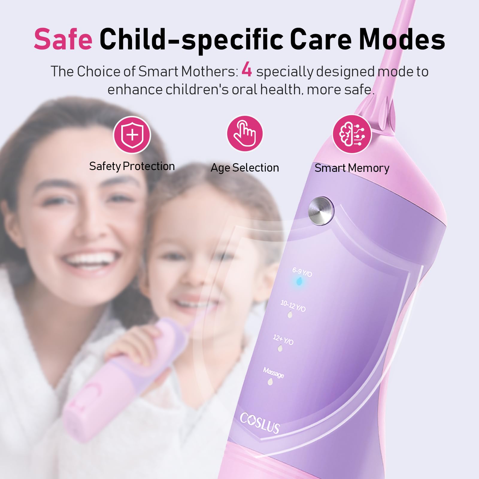 ["4 MODES & 4 Nozzles: Our engineers have developed the Electric Water Flosser with safe water pressure and ensured optimal cleaning effectiveness to cater to the different gum conditions of children in various age groups. It offers modes for children aged 6-9 years, 10-12 years, and over 12 years, as well as a massage mode. Nozzles for daily gumline cleaning and for children.","SAFE AND EASY TO USE: Thanks to the intelligent memory function, it is very convenient once parents help their children choose the appropriate mode. At the same time, this effectively prevents children from inadvertently switching to other modes during use, which can lead to safety issues. IPX7 waterproof.","DEEP CLEANSING: Equipped with 0.6 mm ultra-fine double water jets, the COSLUS Kids Water Flosser has a larger impact area and more even pressure. It can effectively achieve thorough teeth cleaning while protecting children's gums and removing plaque deposits.","EASY TO HOLD FOR KIDS: Designed specifically with an ergonomic shape, the COSLUS Kids Water Flosser comfortably fits into the palms of children, allowing for easy use. Its low-noise design prevents children from being afraid to use it due to loud noises. And with a water tank capacity of 150 ml, frequent refills during use are not necessary.","30 DAYS LONG SERVICE TIME: The COSLUS Kids Water Flosser is equipped with a powerful and eco-friendly battery that can be fully charged in just 2 hours, allowing for continuous use of up to 30 days. Its cordless design makes it a convenient and portable device for use at home, school, or on the go, making it the perfect companion for your oral care routine. Best Valentine's Day-Christmas-Children's Day-Birthday gift for child, friend, boy, girl."]