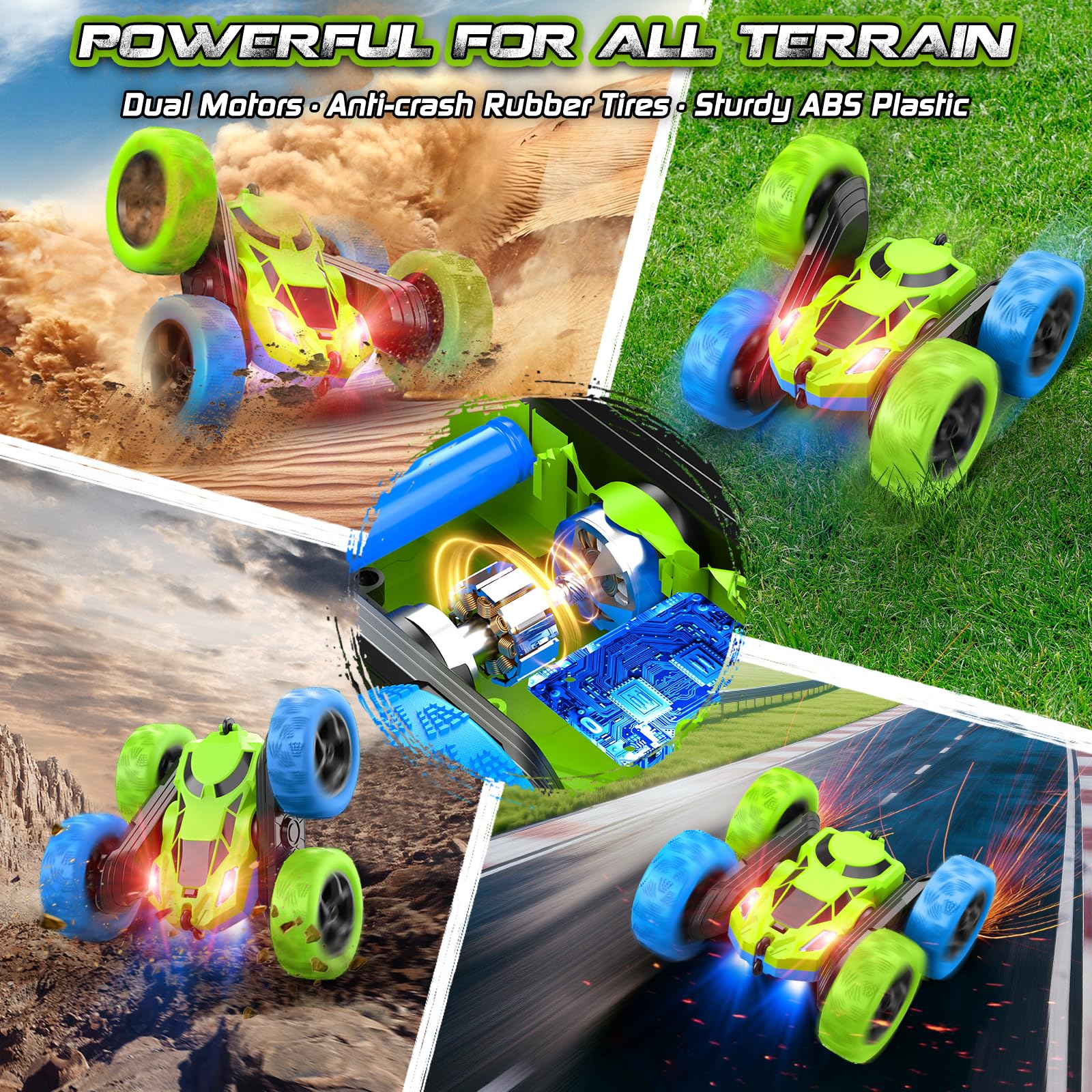 Cosone Remote Control Cars, 2.4GHz Remote Controlled Car Toy with headlights, All-wheel Drive Off-road Stunt Car, Double-sided 360° Rotation, Birthday Gifts for Boys 6+ years old (Blue-Green)