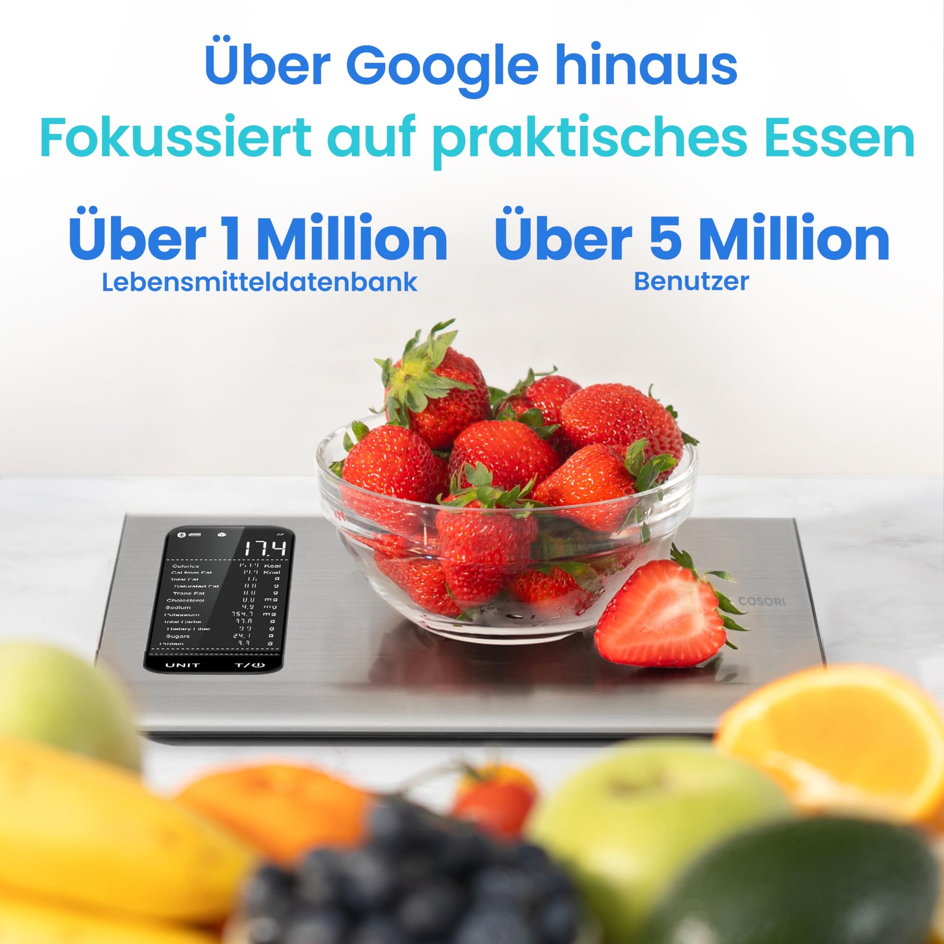 Cosori digital kitchen scale with nutritional calculation, nutrition scale app tracks 19 nutrients, calorie data analysis, 5kg stainless steel food scale, suitable for weight loss, database only for Germany.