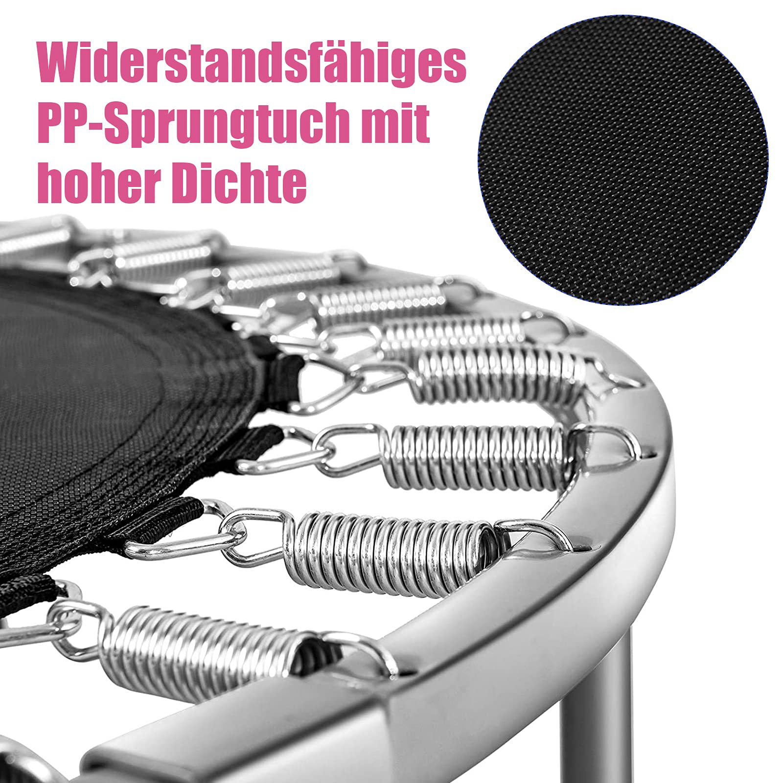 ["【High Security】 The 32 springs with safety buckles distribute the weight evenly and prevent injuries. Additionally, the six steel legs provide a weight capacity of 150 kg. The trampoline is safe to use.",