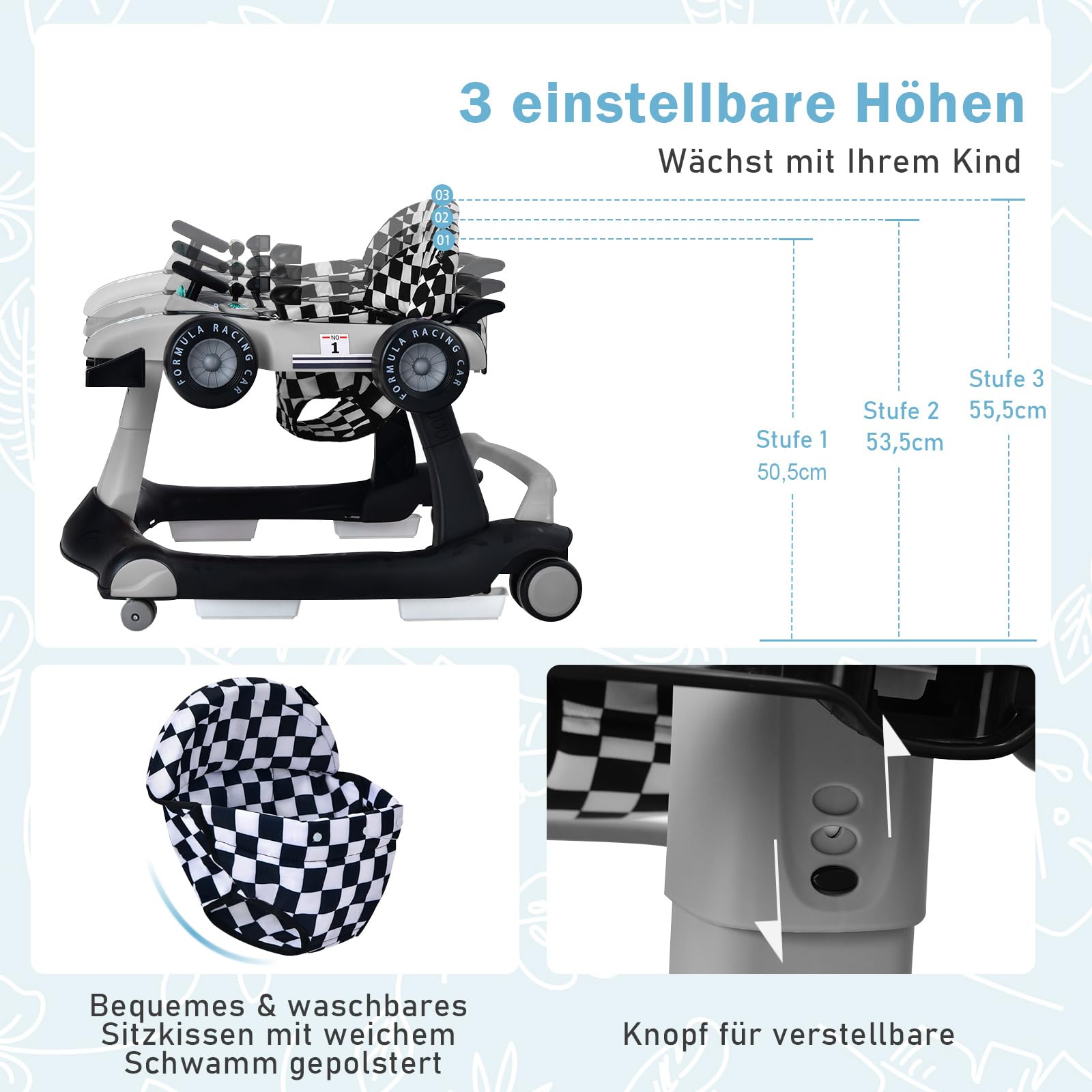 ["🚗【4 in 1 Functions】The walker has a 4 in 1 design, including walker mode, push-behind mode, push car mode, and baby cart mode, meeting various needs of children. Suitable for children aged 6 to 18 months, with a maximum weight capacity of 12 kg.","🚗【Adjustable Height & Speed】The walker has 3 height levels that can be adjusted according to the child's size. The two front wheels are noiseless universal wheels that can change direction, and the speed can be adjusted by two rear wheels.","🚗【Safety & Comfort】The walker is equipped with a headrest to protect the child's head. 5 anti-slip pads on the bottom and 4 non-slip wheels contribute to your child's safety. The seat cover is washable and the backrest is ergonomic.","🚗【Interactive Design】The walker features a steering wheel, gears, 2 light buttons, and 2 mirrors, resembling a small baby cart. It can also play music and requires 2 AA batteries (not included).","🚗【Space-saving Design】With its folding structure, the walker can be easily stored on the wall or under the bed or sofa when not in use.","NOTE: Turn the knob on the rear wheel for speed control. Turn counterclockwise to increase speed, clockwise to brake or stop."]