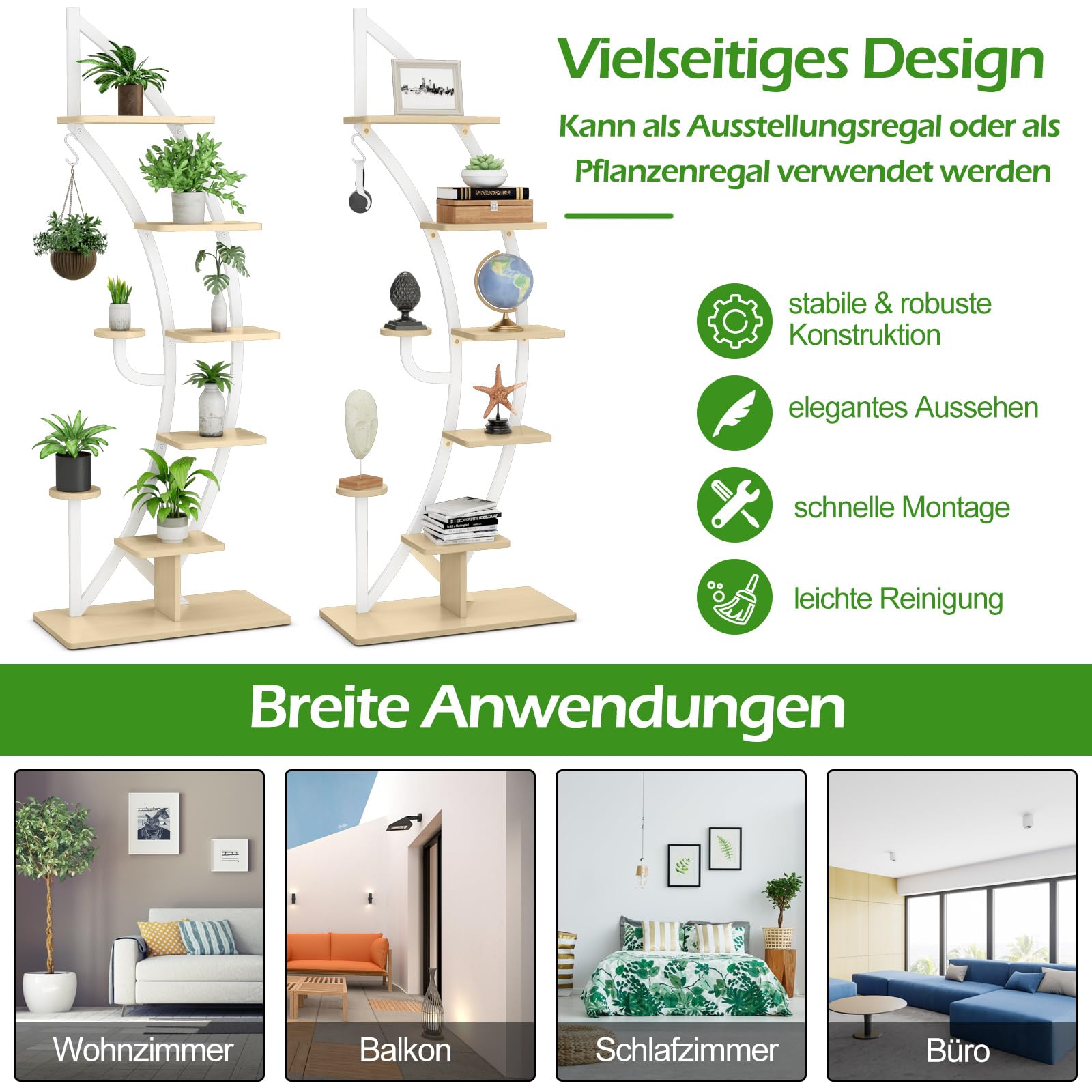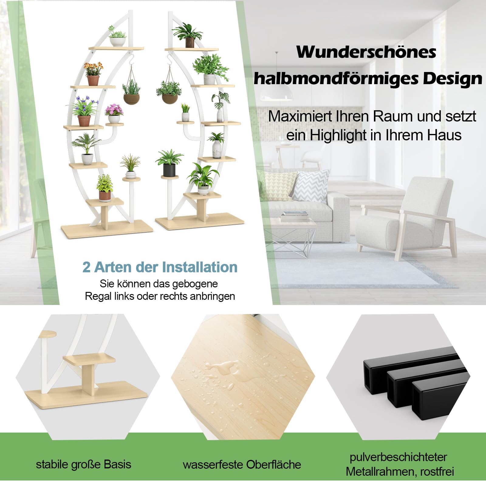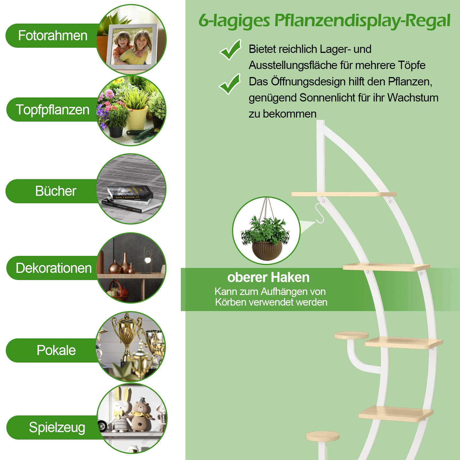 ["🌙【Multilayer Storage Space】 The 6-tier high plant stand shelf adopts a 6-tier ladder structure, providing ample storage space and display area for more pots, while also allowing maximum sunlight for each plant. Additionally, there is an additional top hook for hanging baskets.","🌙【Sturdy Construction】 The flower rack made of metal is supported by a sturdy metal frame made of powder-coated steel, ensuring high rust resistance and durability. And each shelf can hold up to 20 kg. Furthermore, the thickened base has a large contact area with the ground, contributing to more stability.","🌙【Great Stability and Safety】 The plant stand is equipped with an anti-tip mechanism that can be mounted on the wall to increase stability and prevent wobbling and tipping. It also features protective floor pads to prevent slipping and protect your floor from scratches.","🌙【Beautiful Curved Design】 The ladder flower pot stand has a curved crescent shape that can maximize your space and add an element of elegance to any room. Whether in the living room, bedroom, balcony, covered patio, or office, it can be a perfect addition.","🌙【Easy Maintenance and Assembly】 The ladder plant shelf made of veneered chipboard and MDF board is scratch-resistant, smooth, and waterproof for easy cleaning. In addition, it comes with a detailed instruction manual and all necessary parts for easy assembly.","Note: It is not recommended to expose it to rain or sun outdoors."]
