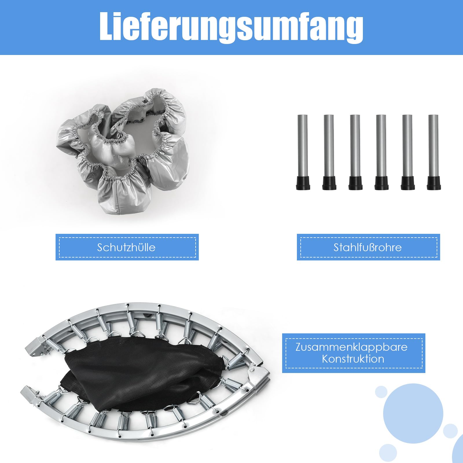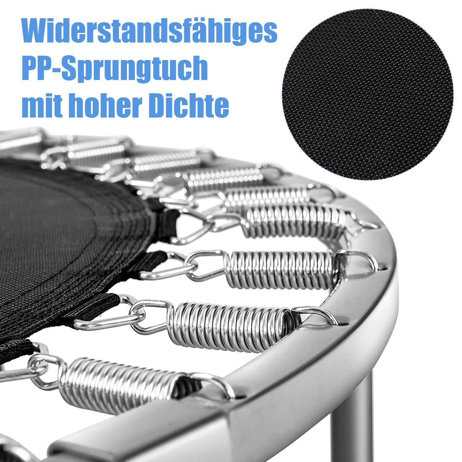 ["High security】 The 32 springs with safety buckles distribute the weight evenly and prevent injuries. In addition, the six steel legs have a capacity of 150 kg. The trampoline is safe to use.",