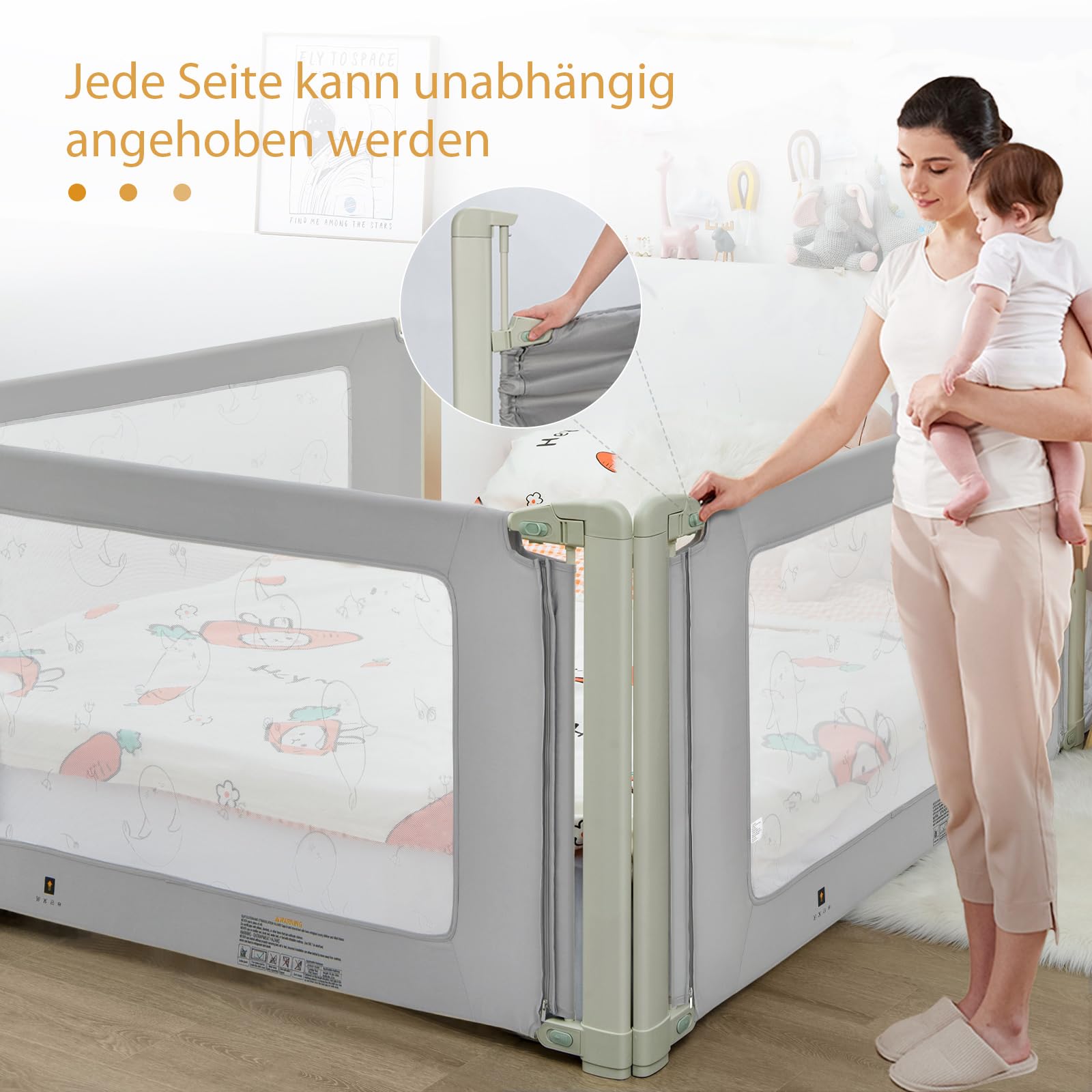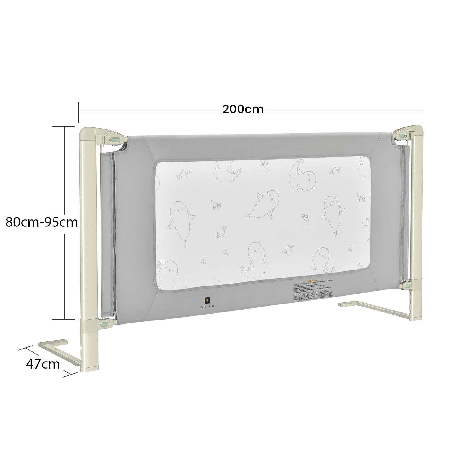 ["【Safety Guarantee】With its exclusive seamless design, this toddler bed rail not only prevents the child from falling out of bed when they toss and turn, but also allows them to have sweet dreams. It also features a double safety lock.","【Adjustable Height】Unlike other standard bed rails, this premium baby gate has 4 adjustable positions ranging from 80 - 95 cm, making it suitable for different mattresses. Each side can be lifted independently, making it convenient for parents to operate with one hand.","【Sturdy Structure】Made with a high-quality metal frame coated with soft polyester, this high-quality baby bed rail with T-shaped support legs ensures high stability and your child's safety. Additionally, the breathable mesh with cute patterns allows you to keep an eye on your baby.","【Versatile Use】With a length of 150/180/200 cm, this extra-long baby bed rail is perfect for most beds. Whether your child is still in need of someone to sleep next to them or is starting to become more independent, this bed rail is a great aid.","【Easy Installation】With a detailed and easy-to-understand manual, this premium baby bed rail can be assembled in a short amount of time without any additional tools, saving you time and energy. It can be machine washed at 30 degrees water temperature."]