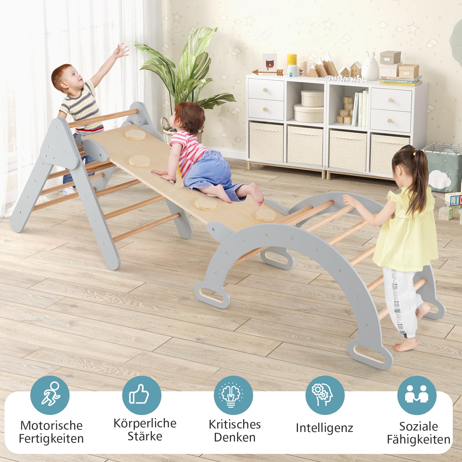 COSTWAY Climbing Triangle with Slide, Climbing Arch, including double-sided ramp, for climbing, sliding and rocking, 4 in 1 climbing frame indoor from 1 year old (Gray)