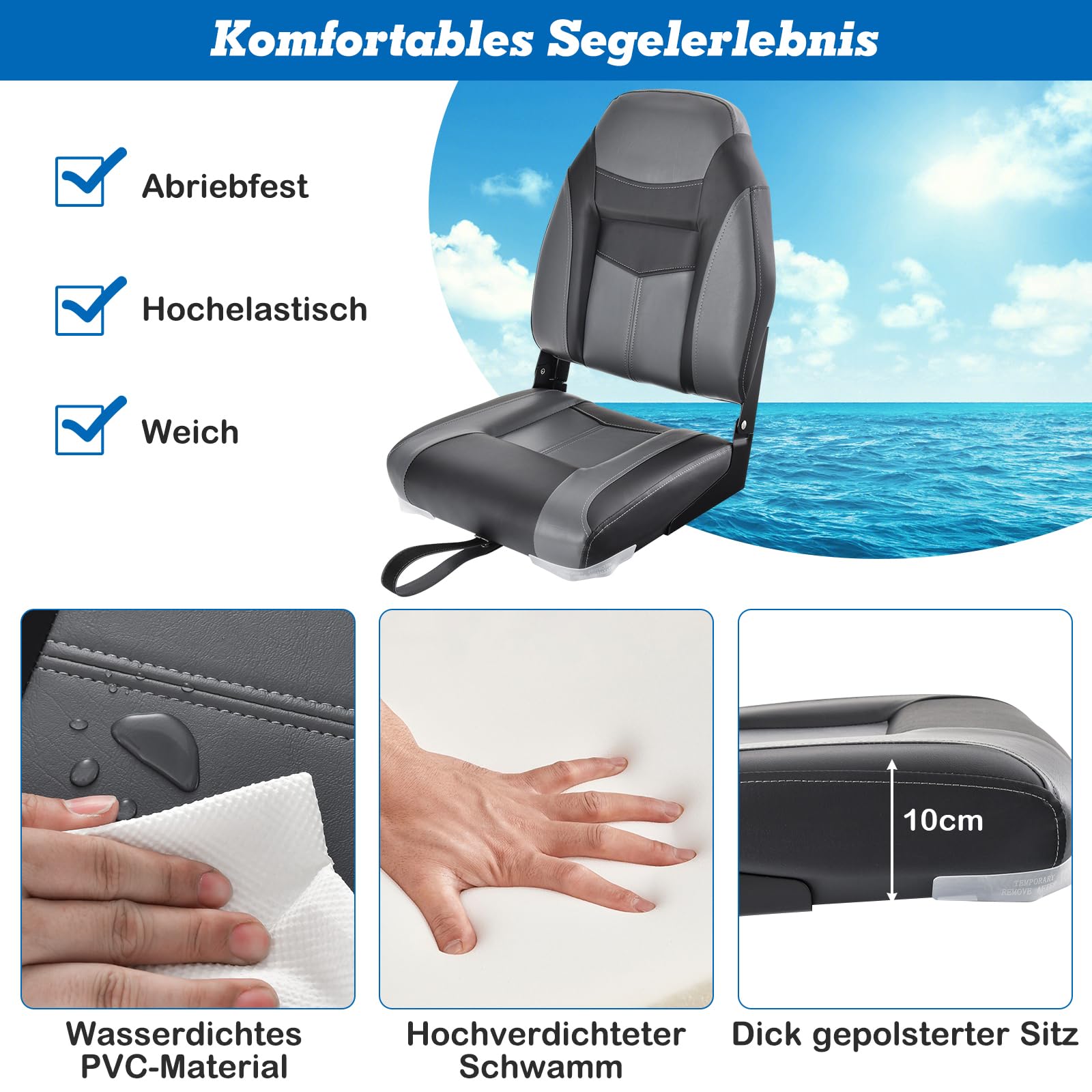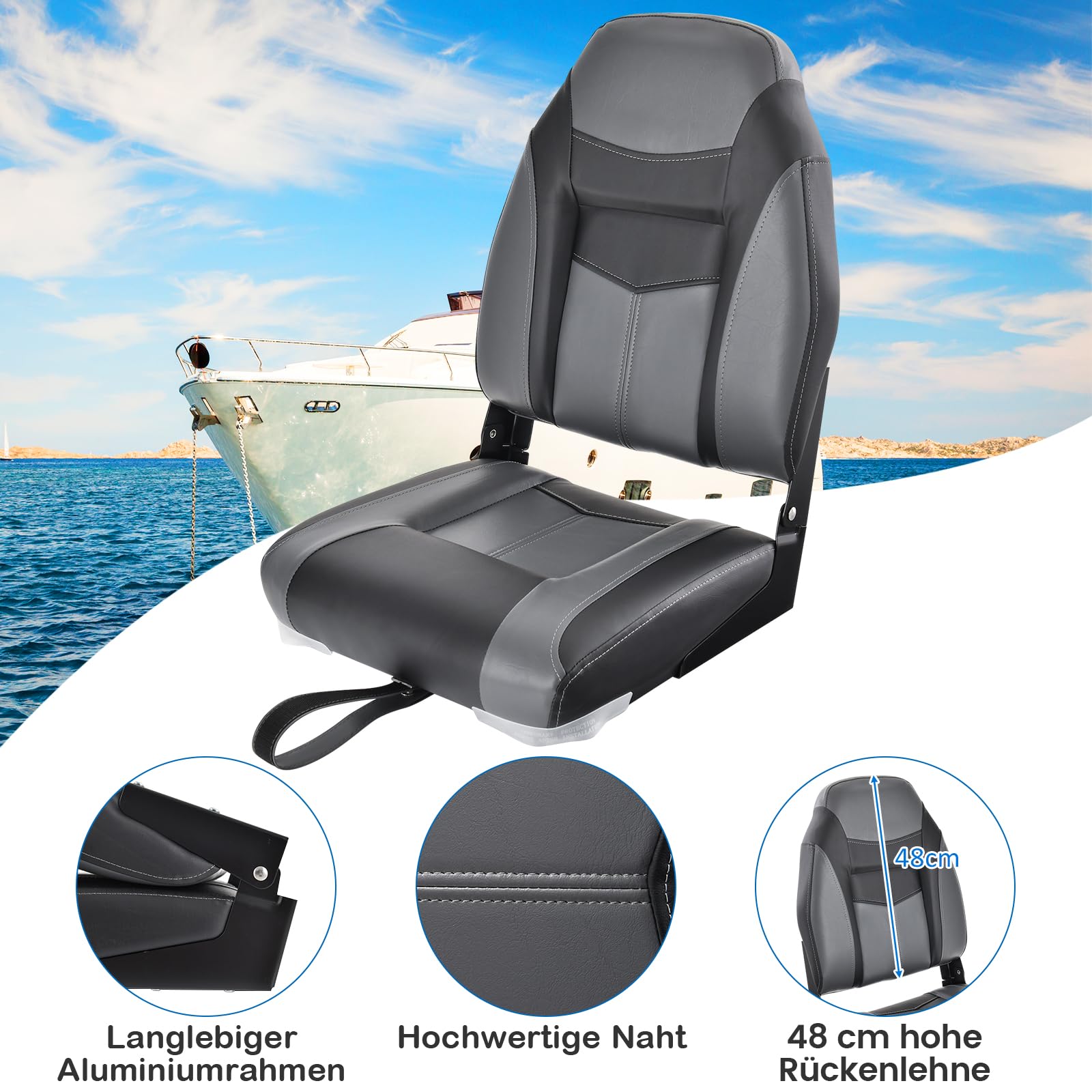 ["Comfortable Sailing Experience】The folding boat seat is specially designed with an ergonomic high backrest to maximize your comfort on long boat trips. In addition, the soft and highly elastic foam-filled seat reduces fatigue from sea turbulence.",