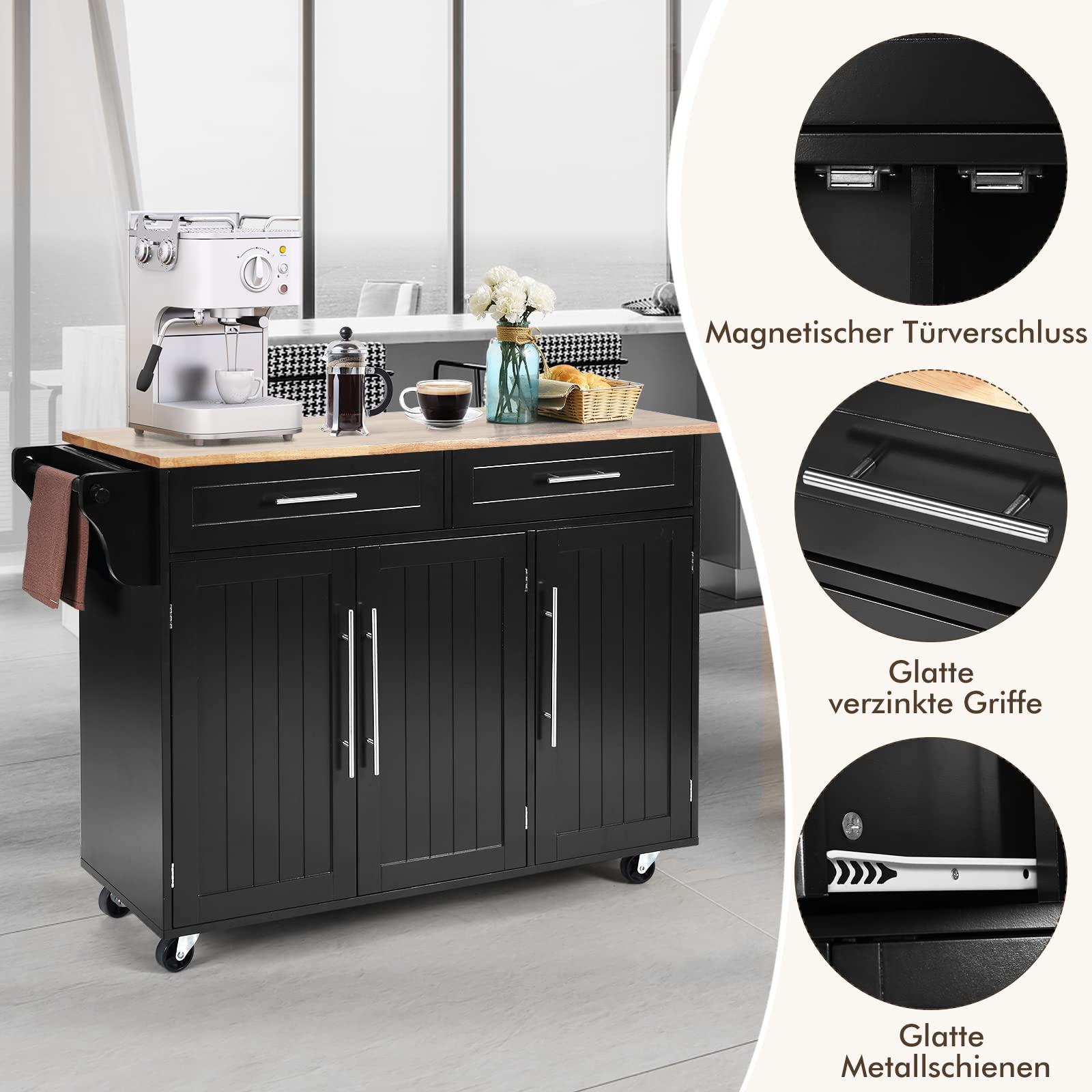 COSTWAY Kitchen Cart on Wheels, Kitchen Serving Trolley with Drawers, Kitchen Island Cart Buffet Cabinet Wood, Kitchen Cabinet with Countertop (Black)