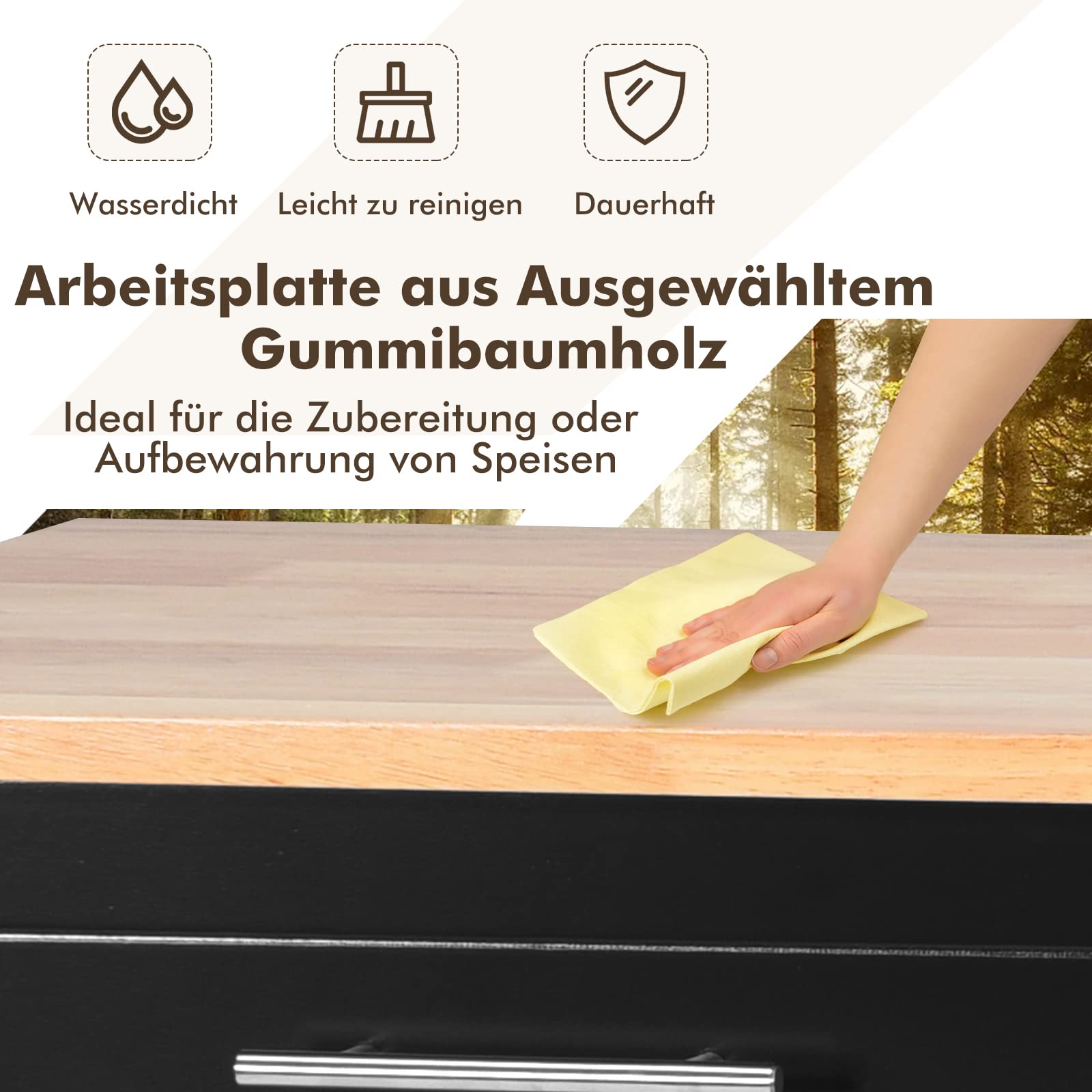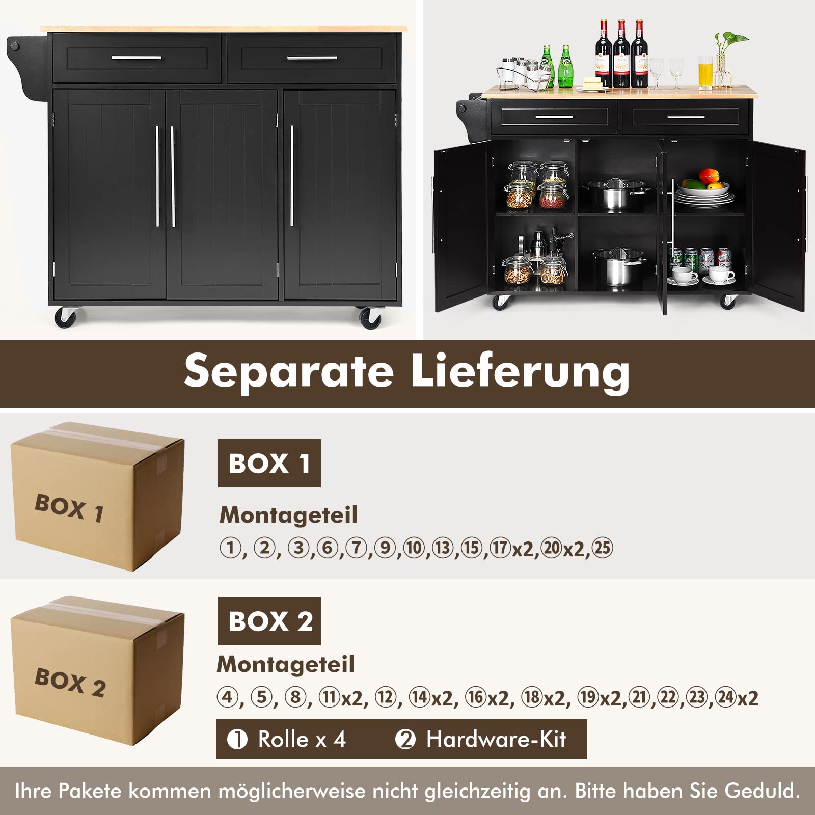 ["Thoughtful design: This kitchen cart features many practical design details. From the towel rack to the knife holder to the various storage compartments, this kitchen cart impresses with thoughtful design.","Sturdy and durable: This item is made of high-quality wood and stainless steel, making it particularly robust and durable. You can rely on this cart as it will serve you well for a long time.","Ample storage space: The kitchen cart has 2 drawers and 3 large compartments where all kinds of kitchen utensils can be stored. Dishes, plates, spice grinders, bottles, napkins, and bottles all fit easily in this cart.","Water-repellent surface: The surface is made of water-repellent wood and is guaranteed not to mold.","With 4 wheels: This kitchen cart has 4 wheels, 2 of which are equipped with locking brakes. The cart can be conveniently and flexibly moved and securely locked in place when in use. Note: This item is only shipped within Germany."]